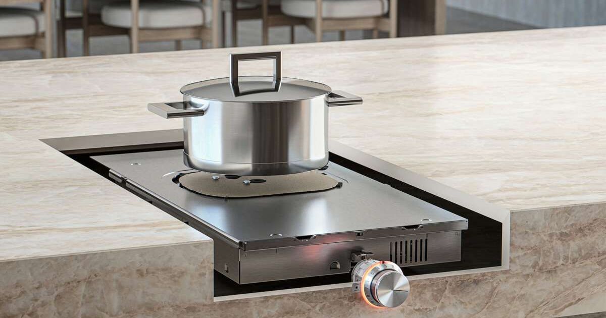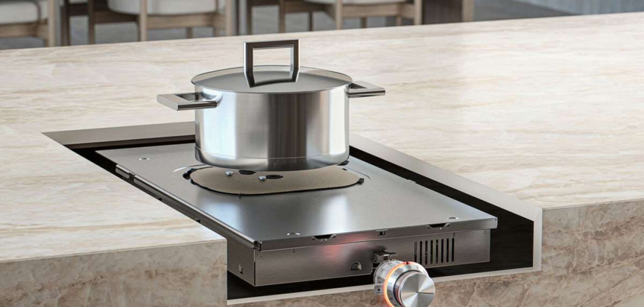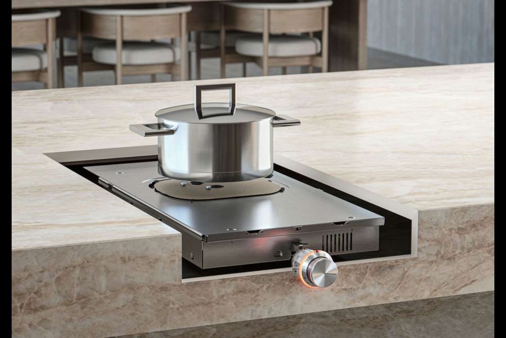 Gaggenau bietet eine vollintegrierte Induktion an. Gekocht wird direkt auf der Arbeitsplatte. Ein LED-Punkt sowie ein Bedienknebel sind die einzigen sichtbaren Elemente. Die markanten an der Vorderseite angebrachten Knebel der Serie 400 von Gaggenau unterstützen den Benutzer während des Kochens. Der LED-Punkt, ein smartes in die Arbeitsfläche eingebrachtes Licht, zeigt die Mitte des Kochmoduls an und somit, wo der Benutzer sein Kochgeschirr platzieren soll. Er signalisiert zudem bestehende Restwärme und erlischt im Anschluss. So verwandelt sich die Kochfläche in einen vielseitigen Bereich, der sich zum Vorbereiten, Servieren, Essen und Arbeiten eignet. Die vollintegrierte Induktion ist so konzipiert, dass sie exklusiv mit Dekton-Arbeitsplatten kombiniert wird. Cosentino, der Hersteller von Dekton, bietet diese in mehr als 60 Ausführungen, Designs, Farben und in Grössen von bis zu 3200 × 1440 mm an. Darüber hinaus garantiert er deren CO2-Neutraliät. Unter der 12 mm starken Arbeitsplatte befinden sich die leistungsfähigen 210 bzw. 280 mm grossen Induktionsmodule. Sie bieten das volle Spektrum von Gaggenau: zwölf Leistungsstufen, Warmhalte- und Booster-Funktion sowie ein beleuchteter Bedienknebel in markantem Edelstahl oder elegantem Schwarz.