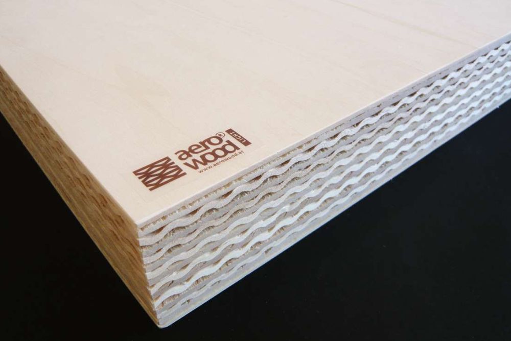 Die Leichtbauplatte «Aerowood» des österreichischen Sperrholzwerkes Schweitzer GmbH lässt sich einfach bearbeiten und benötigt keine Einleimer. Durch das geringe Gewicht, die hohe Stabilität und die einfache Verarbeitbarkeit werden ganz neue Möglichkeiten im Leichtbau eröffnet. Der Anwender kann seine gewohnte Flexibilität im täglichen Produktionsablauf erhalten, weil die Platten frei und ohne Raster formatierbar sind und beim Setzen von Schrauben oder beim Aufleimen von Kanten keine zusätzlichen Arbeitsschritte oder Materialien benötigt werden. «Aerowood» besteht aus geschältem Wellenfurnier, das abgesperrt zu Platten verleimt wird. Die Deck- und Dekorschichten können auf den selbsttragenden Wellenkern verpresst werden. «Aerowood» ist als Light-Version und als Compact-Version erhältlich, von denen Letztere eine höhere Resistenz gegen Druckbelastung aufweist. Im Februar 2020 zeichnete das German Design Council, der Rat für Formgebung, die Leichtbauplatte mit dem German Design Award 2020 aus.