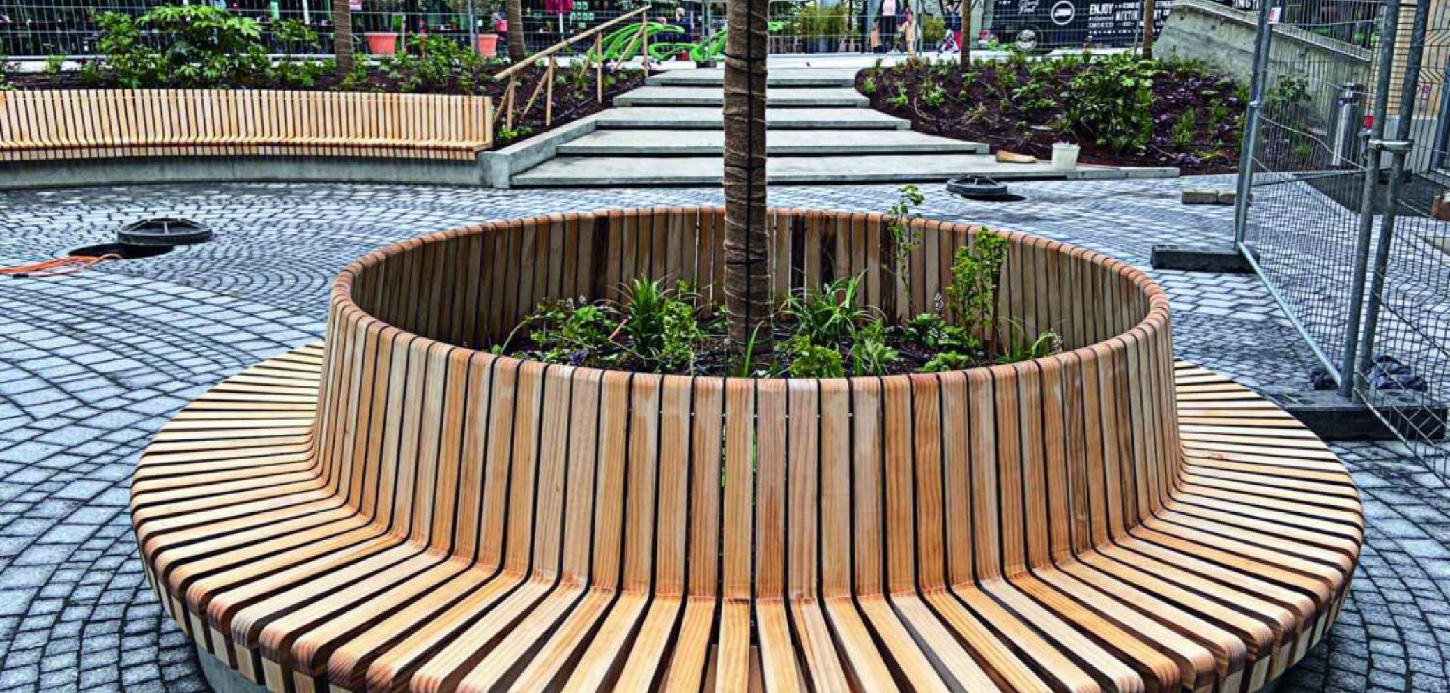 Vor dem Einkaufszentrum Sihlcity in Zürich laden neue Aussenbänke zum Verweilen ein. Marius Allenbach, der sich im dritten Lehrjahr bei der Schäfer Schreinerei AG in Dielsdorf ZH befindet, hat den Grossteil der Banklatten hergestellt und montiert.