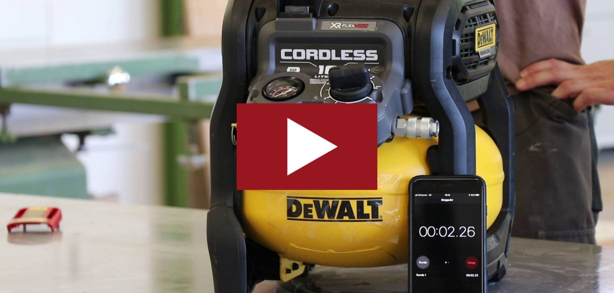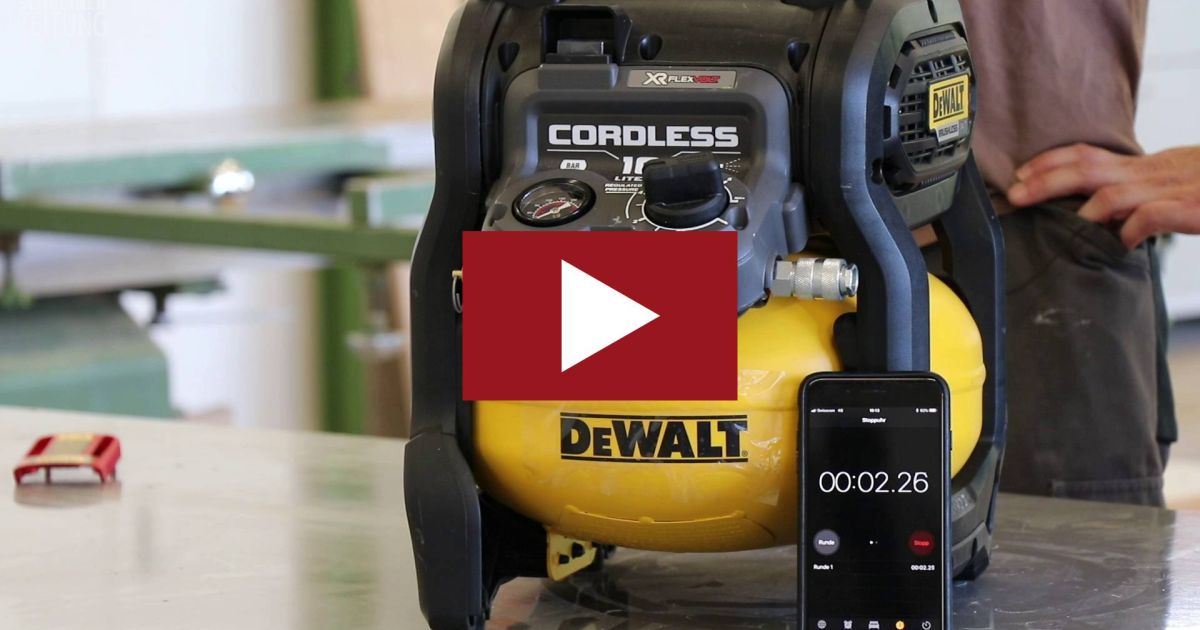 Video. Der Elektrowerkzeughersteller Dewalt hat einen Akku-Kompressor im Angebot. Was dieser leisten kann, zeigen zwei Fachredaktoren der SchreinerZeitung im Video.