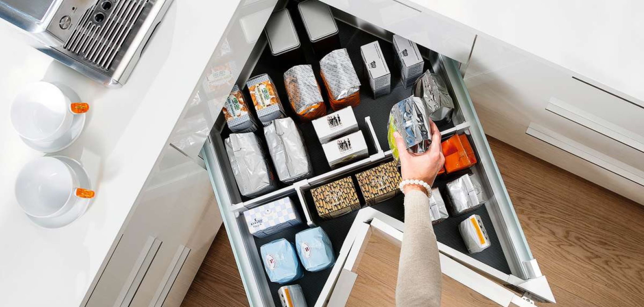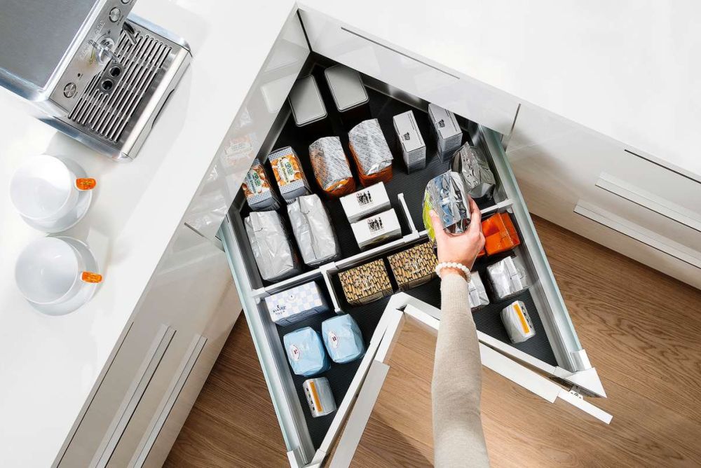 Der «Space Corner» ist bezüglich Planung sowie Montage eher etwas aufwendiger, und auch er vermag nicht den gesamten Raum des Eckschrankes auszunutzen. Dafür lassen sich die Schubladen in der Höhe individuell einplanen und ganz gewöhnlich einteilen sowie nutzen. Somit finden im Eckschrank auch kleine Gegenstände oder Besteck ihren Platz.