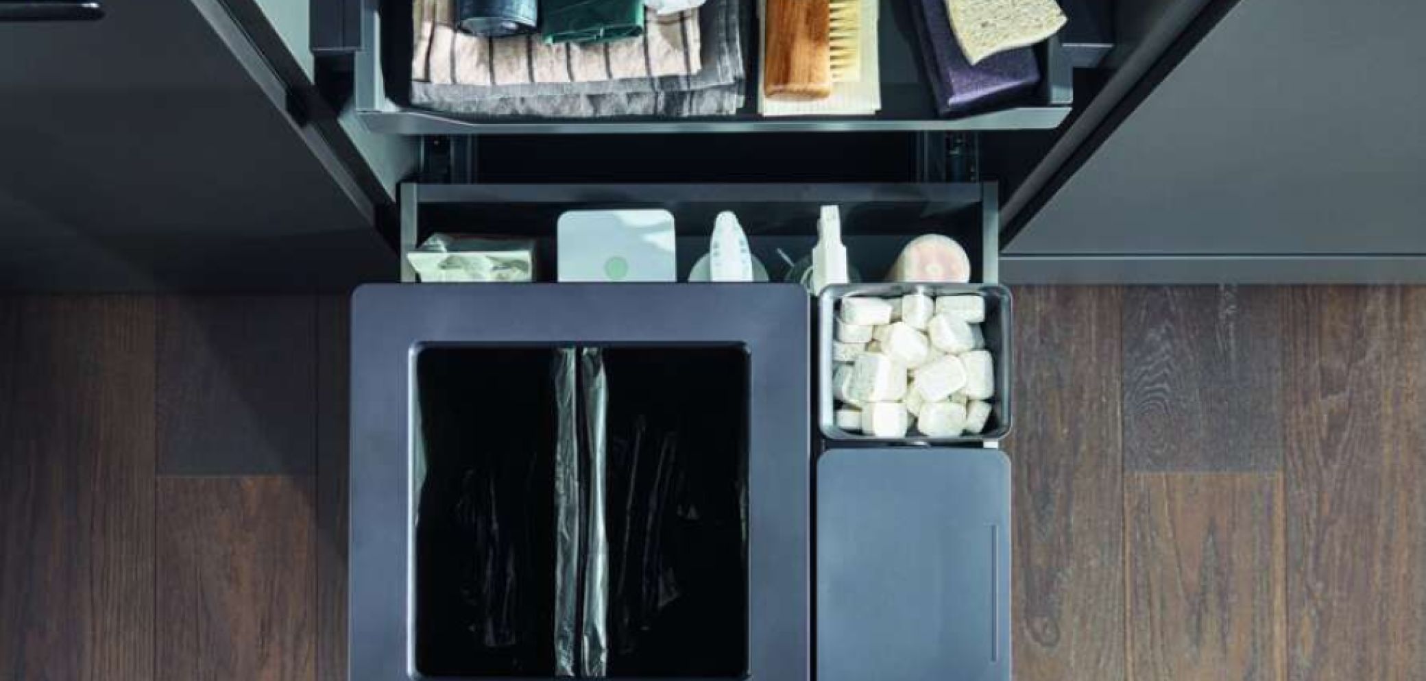 Das Abfalleimer-Set «Oeko Universal» von Peka kann in allen gängigen Schubladenauszügen von Blum, Grass und Hettich eingesetzt werden. Der Abdeckrahmen des Eimers, die Trennwand sowie das ausziehbare Metalltablar sind um 30 mm höhenverstellbar und lösen so laut Hersteller alle Probleme mit tiefen, modernen Spülen, ob aufgesetzt oder von unten geklebt. Handlich und grosszügig geformte Eimer bieten hohe Flexibilität im täglichen Gebrauch. Das Spannsystem für Abfallsäcke garantiert eine leichte und schnelle Handhabung, und es können Abfallsäcke verschiedener Grössen von 15 bis 50 Liter fixiert werden. Das ausziehbare Metalltablar bietet eine Ablage für Abfallsackrollen, Reinigungsmittel, Schaufel, Wischer und weitere Kleinutensilien. Die in der Tiefe verstellbare Rückwand passt sich dem Spülbecken an.