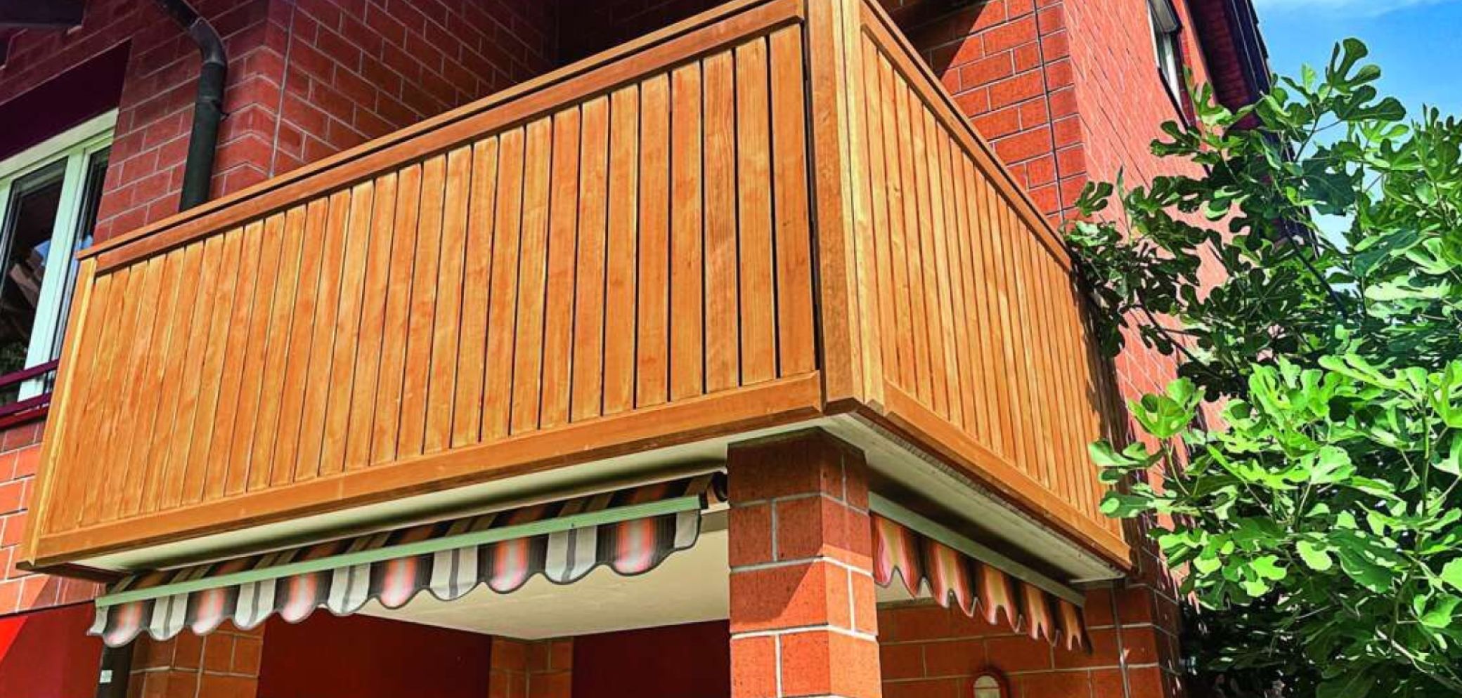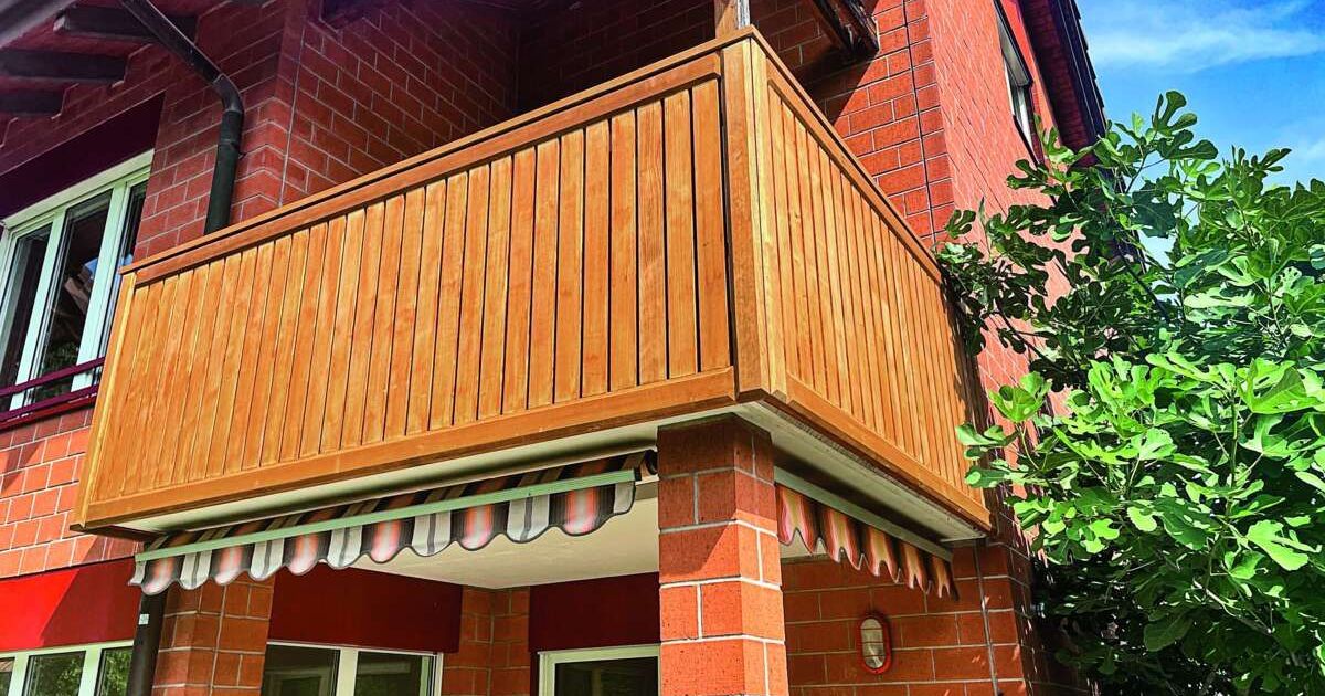 Das Balkongeländer aus Fichtenholz passt gut zur Fassade. Bild: Léonie Waeber