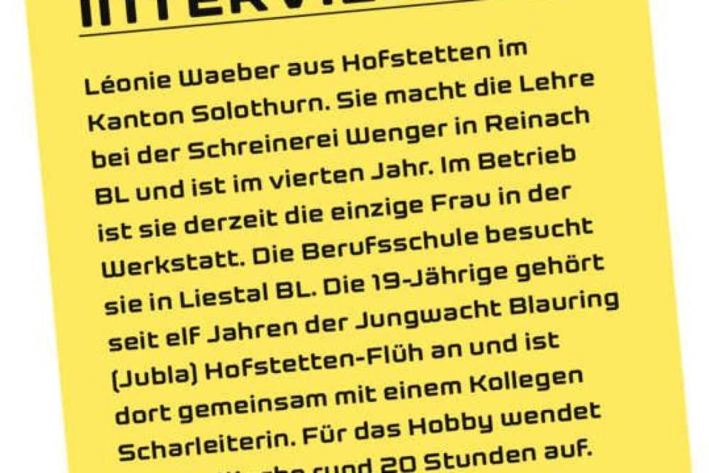 Léonie Waeber aus Hofstetten im Kanton Solothurn. Sie macht die Lehre bei der Schreinerei Wenger in Reinach BL und ist im vierten Jahr. Im Betrieb ist sie derzeit die einzige Frau in der Werkstatt. Die Berufsschule besucht sie in Liestal BL. Die 19-Jährige gehört seit elf Jahren der Jungwacht Blauring (Jubla) Hofstetten-Flüh an und ist dort gemeinsam mit einem Kollegen Scharleiterin. Für das Hobby wendet sie pro Woche rund 20 Stunden auf. Zudem geht Léonie Waeber regel-