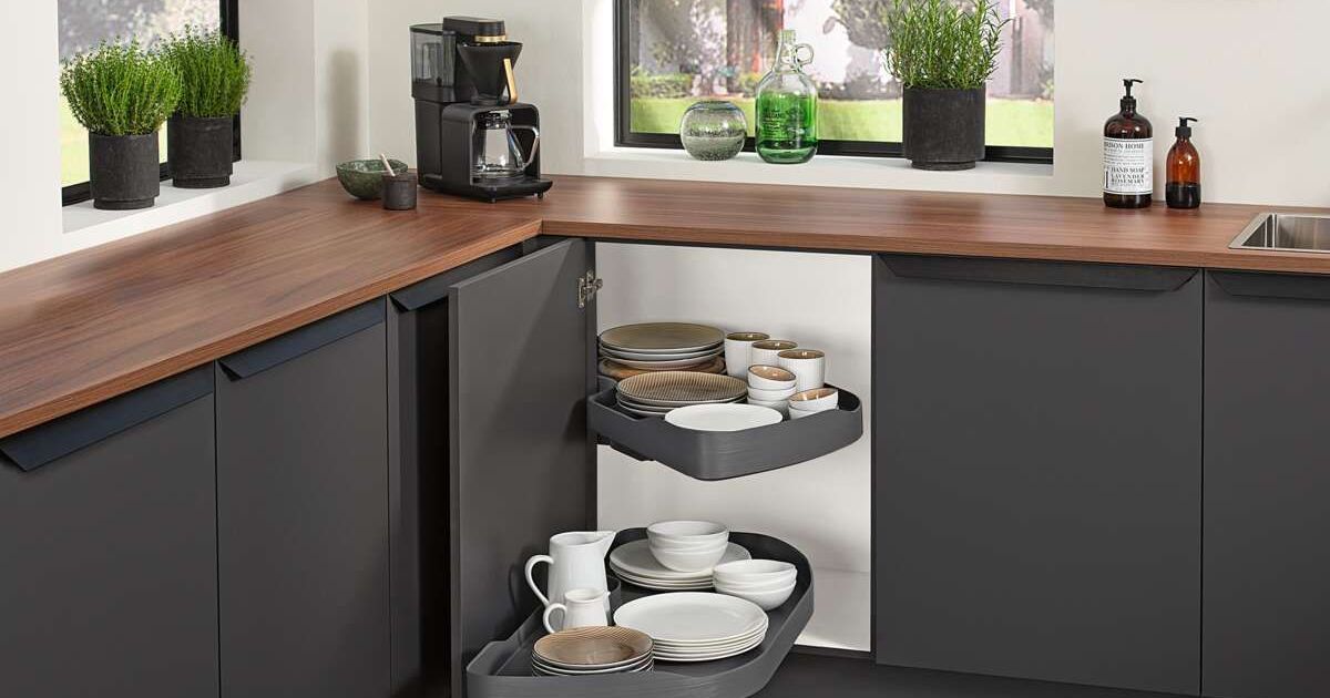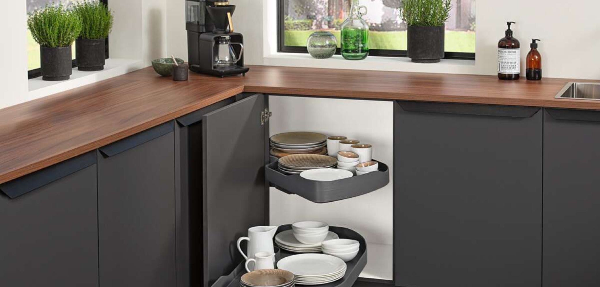Mit dem «Trigon» lässt sich laut seinem Hersteller die Küchenecke neu erfinden. Die Basis bildet ein einheitlicher Beschlag, der für alle Ausführungen und Schrankbreiten zum Einsatz kommt. Die jeweils bis 25 kg belastbaren Dreh-Schub-Böden nutzen den Raum optimal in Eckunterschränken sowie in Abschlussschränken einer Küchenzeile. Normal ist der Einsatz des «Trigon» in Halbkreisboden-Eckschränken mit 45er-, 50er- oder 60er- Breite, eher ausgefallen in Abschlussschränken. Wurden an dieser Stelle bisher kleine Dreiecksregale gebaut, nutzt diese Eckschranklösung nun fast den ganzen Raum hinter der Küchenfront. Organisch geformt und mit reliefartiger Oberfläche kommen die fein genoppten Dreh-Schub-Böden daher. Ausserdem wurde an eine dritte Ebene direkt unter der Arbeitsplatte gedacht. Hier bieten sich neue Nutzungsmöglichkeiten an, beispielsweise zur Besteckaufbewahrung oder zur sicheren Ablage flacher Gebrauchsgegenstände. Der Beschlag lässt sich werkzeuglos montieren. Ebenso werkzeug- und zudem stufenlos können die Boden-Aufnahmen vom Endkunden in der Höhe verstellt werden.