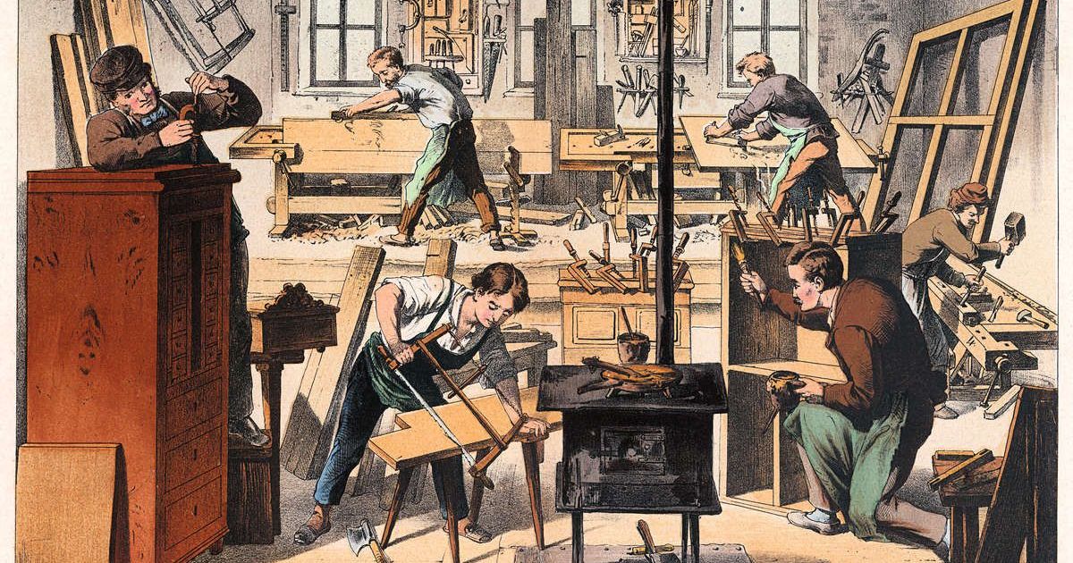 Ein Workshop für Schreiner 1875: Das Tragen der Schürze war für Schreiner immer zweckmässig, bot sie doch Schutz vor Leim an der Kleidung. Bild: Fotolia/Archivist