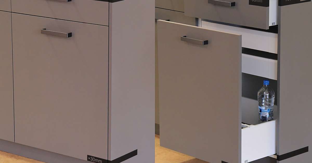 Das Sortiment «AK+85» wurde ausserhalb jeder Küchennorm entwickelt. Die Frontenaufteilung befindet sich ausserhalb eines Rasters, aber trotzdem in einer optisch ansprechenden Höheneinteilung. So können die Platzmöglichkeiten im Möbel so optimal wie möglich gestaltet werden. In diesen durchdachten Schubladen finden im unteren Teil 1,5-Liter-Pet-Flaschen Platz. In der obersten Schublade, ausgeführt mit einer Blum Legrabox K-Zarge, können beispielsweise Gewürzdosen oder Kaffeetassen platziert werden. Diese Einteilung der Schubladen bietet auch grosszügige Platzverhältnisse unterhalb des Kochfeldes. Ein Verstärkungssteg für dünne Arbeitsplatten findet problemlos im Möbel Platz. Niedrige Schubladenzargen gehören definitiv der Vergangenheit an.