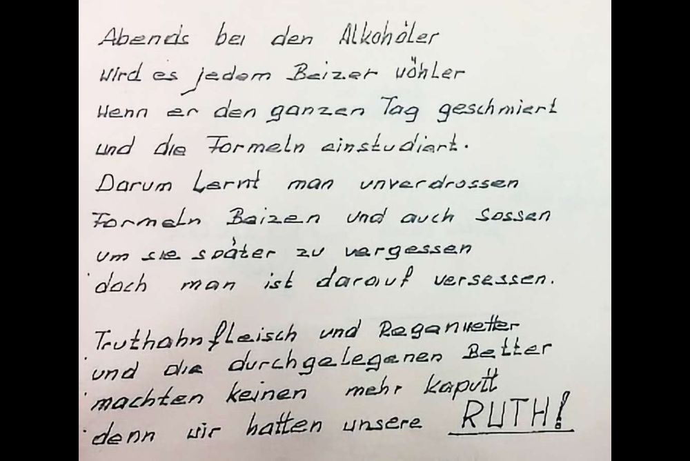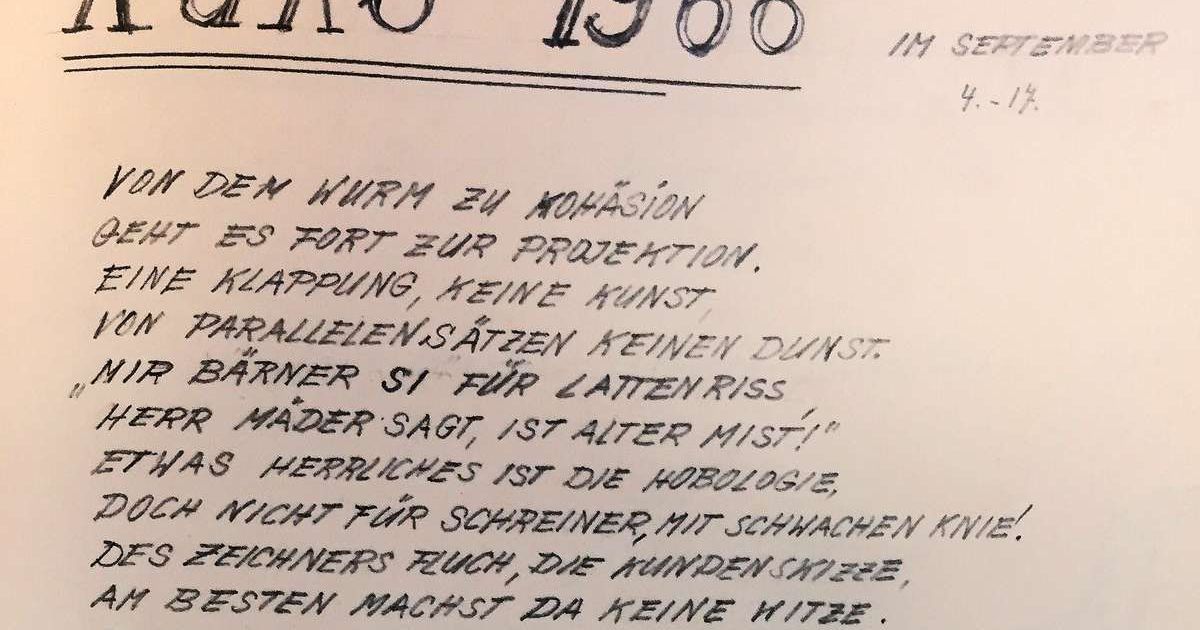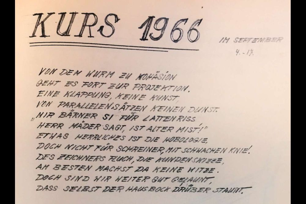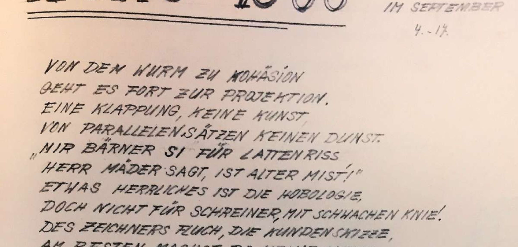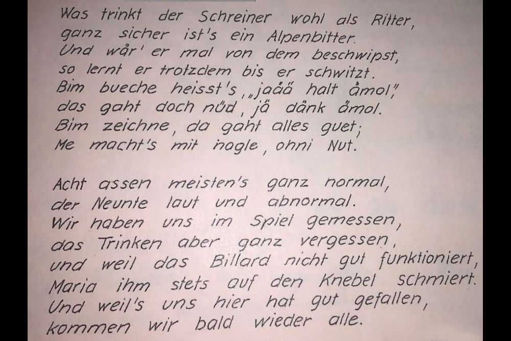 Die Einträge im Gästebuch beweisen, dass es unter den Schreinern schon immer eine Anzahl Poeten gab, die Texte in Versform schreiben konnten. Allerdings gelang dies nicht immer perfekt.