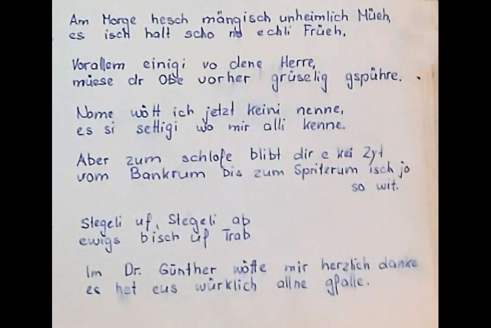 Und doch sollen die Textbeispiele aus dem Meisterkurs 1962 und 1966 und dem Oberflächenkurs 1974 und 1987 der Öffentlichkeit nicht vorenthalten bleiben. Leider sind die Schöpfer der Reime nicht namentlich bekannt. Es ist jedoch eindeutig ersichtlich, dass in den Meisterkursen doch diejenigen mit den feineren Sprachklingen sassen.