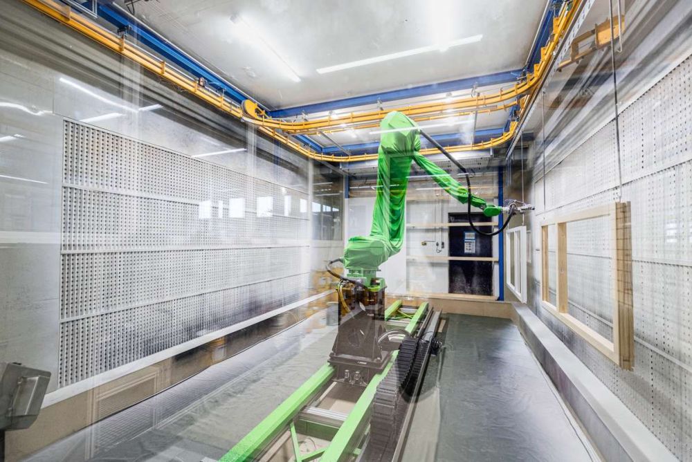 Was für welchen Betrieb geeignet ist, hat mit der produzierten Menge und den Platzverhältnissen zu tun. Die Oberflächenbearbeitungsanlage und somit auch das Grundiersystem müssen firmenspezifisch und immer mit allen erforderlichen Fachleuten besprochen und geplant werden. Denn die Auswirkungen der Anlagenwahl können bis in die Fensterkonstruktion hineinreichen. Alleine schon der Umstand, dass Fenster immer grösser werden, verlangt nach einem entsprechend hohen Raum, denn nebst dem Platzbedarf fürs Aufhängen müssen darüber auch die Förderanlage mit den Haken so-wie die Belüftungstechnik untergebracht werden. Bei heutigen Anlagen legt man aus- serdem grossen Wert auf Ökologie und Nachhaltigkeit. Wird beispielsweise bei den Anlagen der New Wälti AG der Lackierprozess unterbrochen, schalten sie sich automatisch in den Sparmodus.