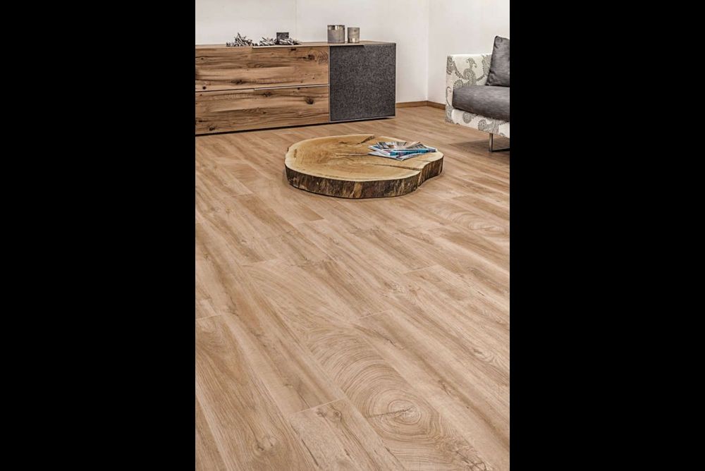 Das neuartige Dekorkonzept «ENDgrain» von Kaindl Flooring wirkt wie ein Querschnitt durch den Baumstamm – und ist dem Echtholzbereich doch baumhoch überlegen, da nicht mit dem Verziehen von echtem Hirnholz gerechnet werden muss. Die dargestellten Stirnholzelemente zeigen puristische Eleganz, Authentizität und Natürlichkeit. Die Landhausdiele im Format 1383 × 159 mm nutzt die Vorteile der Designentwicklung bei Laminatböden aus und zeigt damit dem Echtholzbereich seine Grenzen auf. Das Dekor vermittelt der Diele eine Lebendigkeit, indem es die Schönheit der Natur darstellt und ihr eine bisher unbekannte Bühne schafft. Somit können alle Facetten der Holzstruktur zur Geltung gebracht werden.