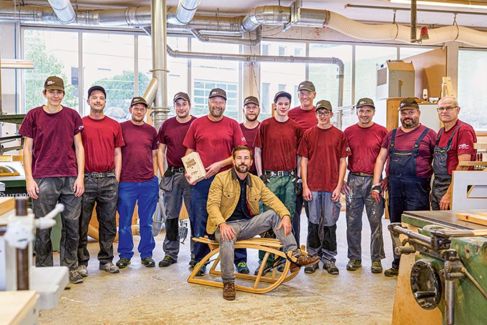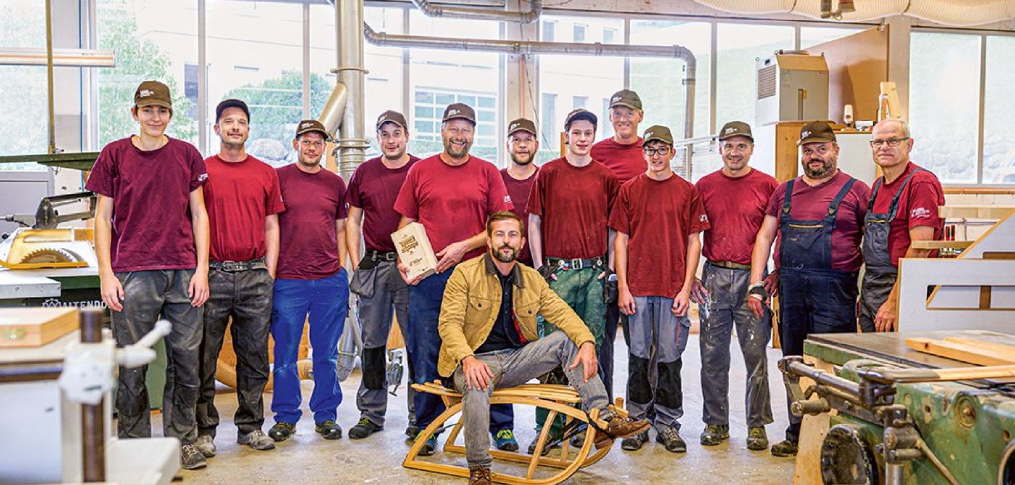 Verpackt in einem edlen Holzkistchen, natürlich aus Weisstanne, findet der Schnaps in der Holzbranche grossen Anklang. Die ersten Auslieferungen hat der Musiker gleich selbst übernommen, unter anderem bei der Ambauen Treppen AG (oberes Bild). Dabei bewies er echtes Interesse an der Branche und am Schweizer Handwerk.