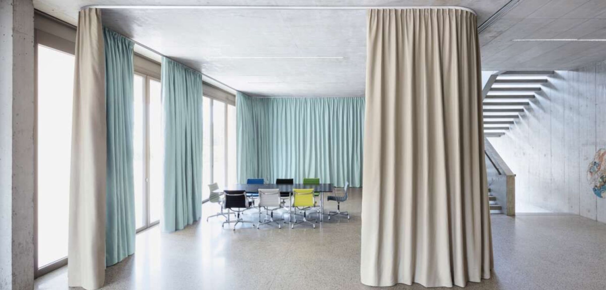 In der Büro-Architektur führt der Trend zum OpenSpace zu einer erhöhten Lärmbelastung der mitarbeitenden Personen. Untersuchungen zeigen, dass die Leistungsfähigkeit bei Lärmbelastung um 10 bis 15 Prozent sinkt. Textilien helfen, den Lärmpegel zu reduzieren. Nebst akustisch wirksamen Platten – oft aus Filz – kommen auch Vorhänge, zuweilen raumtrennende, zum Einsatz. Besonders in dieser Hinsicht wird die Bedeutung des Letztgenannten nun nochmals unterstrichen. Das Schweizer Textilunternehmen Création Baumann hat kürzlich den «Acoustic Divider Vario» mit Noiseblocker in sein Produktportfolio aufgenommen. Dieser Vorhang zeichnet sich nicht nur durch eine ausserordentlich effektive Schalldämmung und Schallabsorption aus, sondern wird zudem durch passende Führungsschienen ergänzt. Diese Entwicklung eröffnet Schreinerinnen und Schreinern eine vielversprechende Gelegenheit, in Zusammenarbeit mit Einrichtungsfachleuten raumtrennende Elemente auf vergleichsweise unkomplizierte Art und Weise zu planen und zu installieren.