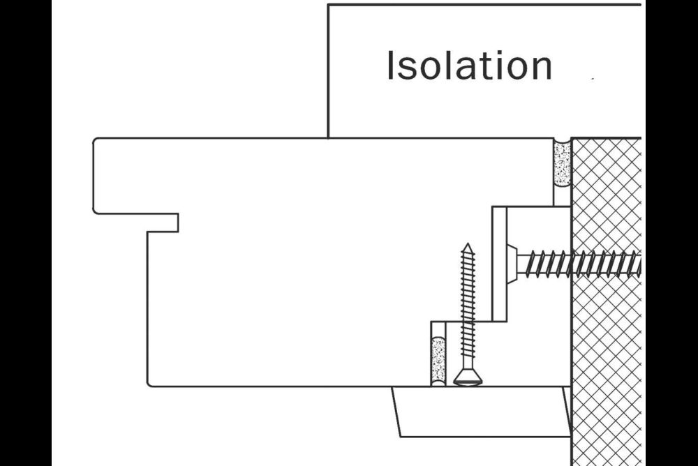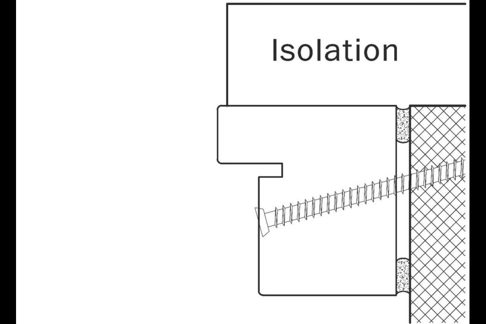 Der Blocktürrahmen ist nicht auf die Wand montiert, sondern dazwischengehängt, und die Befestigung ist somit der Schwerkraft ausgesetzt. Die Mauerdübel müssen schallabsorbierend sein. Brandschutztüren bilden da die Ausnahme, da spezielle Dübel vorgeschrieben sind. Jeder Kontaktpunkt mit der Wand sollte zudem mit einem schalldämmenden Band vollflächig unterlegt sein. Der Kontakt von festen Elementen wirkt übertragend, egal, ob das die Falzleiste, eine Nutleiste oder direkt der Rahmen ist. Eine Aussenisolation aus Styropor kann Schall verstärkt weiterleiten. Es empfiehlt sich da, etwas Luft zum Rahmen zu lassen und den Spalt mit Silikon auszufugen.