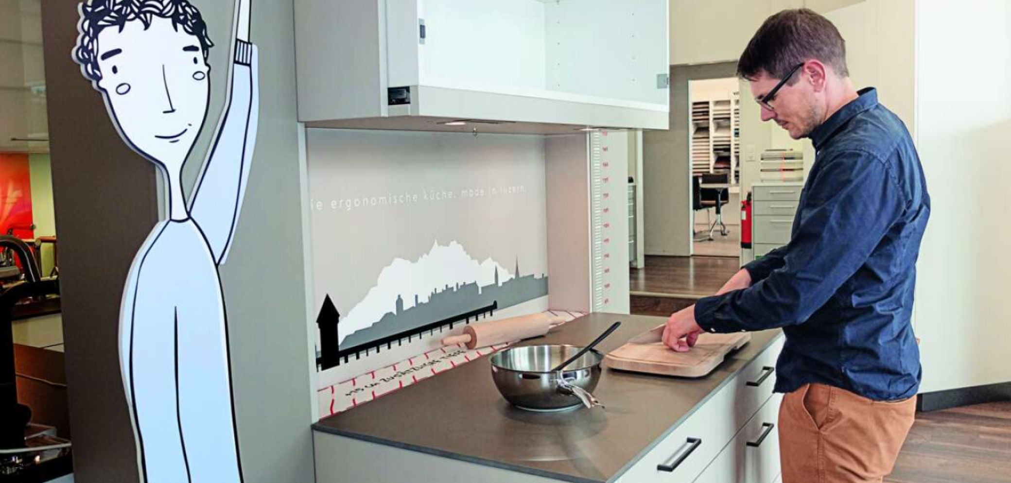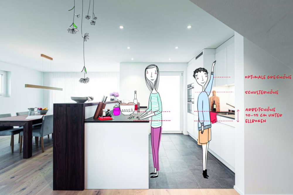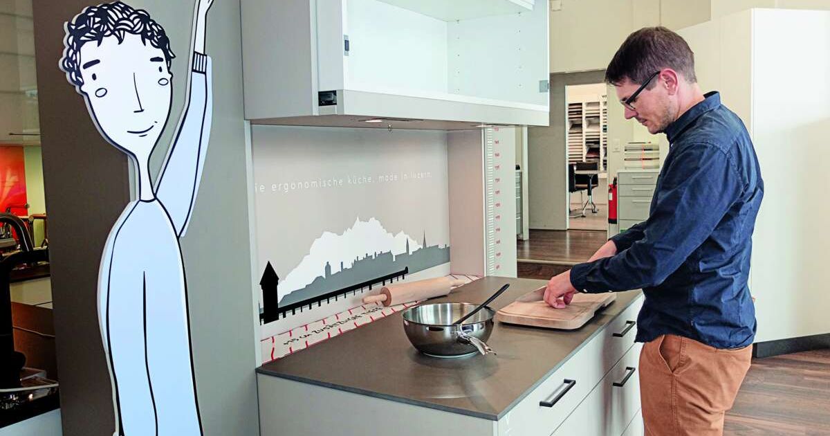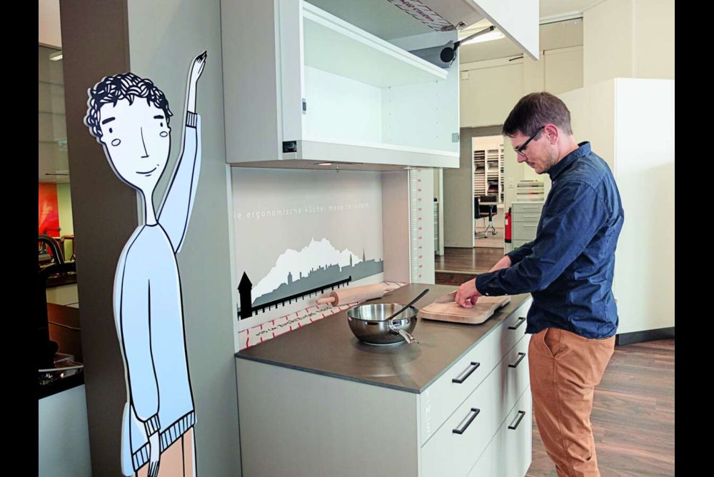 Duss hat das Variable Mass System als Mitglied der Technischen Arbeitsgruppe des Branchenverbandes Küche Schweiz eingebracht. Sein Wunsch ist, dass die Küchenbauer die von ihm angestossene Weiterentwicklung der Norm mittragen. «Dazu benötigt es weitere Untersuchungen im Bereich Ergonomie und Anthropometrie», sagt Duss – und die Player in der Branche müssten bereit sein, diese Untersuchungen zu finanzieren. Noch steht die Diskussion am Anfang. Was sich aber abzeichnet: Die Höhe der Arbeitsfläche wird zu einem individuellen Kompromiss werden. «Es ist wichtig zu wissen, wer in der Küche wirkt und welche Arbeiten primär anfallen», sagt Engelbert Weis von Elbau. Um die Bedeutung der passenden Arbeitshöhe aufzuzeigen, setzen Hersteller in ihren Ausstellungen verstellbare Korpusse ein. «Sogar die Höhe der Schuhe, die er oder sie gewöhnlich in der Küche trägt, berücksichtigen wir», sagt Duss.