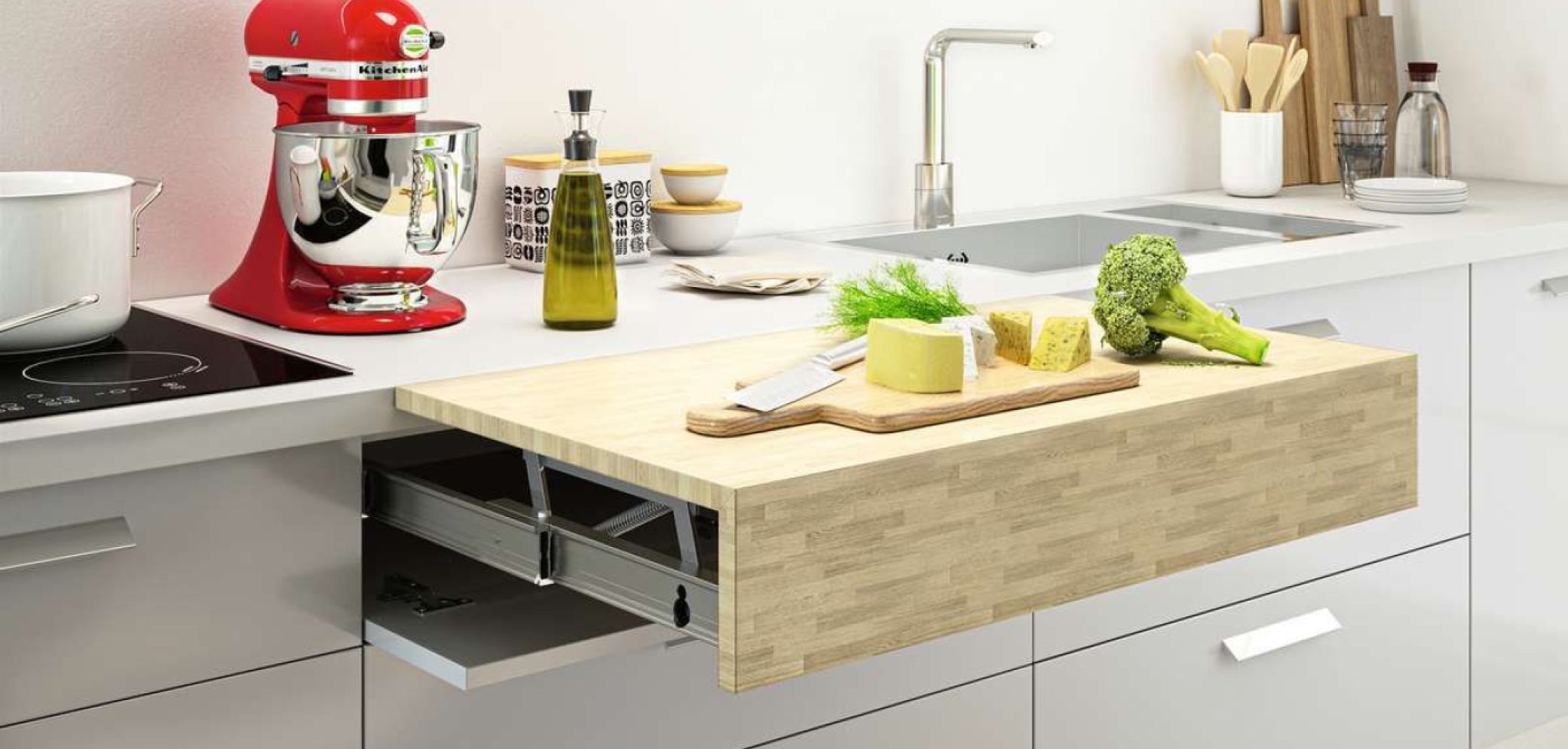 Am Stand von Atim herrscht stets Betriebsamkeit. Es wird eifrig ausgezogen und geklappt, zusammengeschoben und -gefaltet. Atim ist auf Beschläge spezialisiert, die mit wenig Raum viel Nutzen generieren. Fast etwas unspektakulär, aber von praktischem Nutzen, zeigt sich der Beschlag «Oplà». Mit ihm lässt sich in den gängigen Breitenmassen die Abdeckung mit wenigen Handgriffen vergrössern. Mit 40 Kilogramm belastbar kann darauf fleissig gerüstet werden.