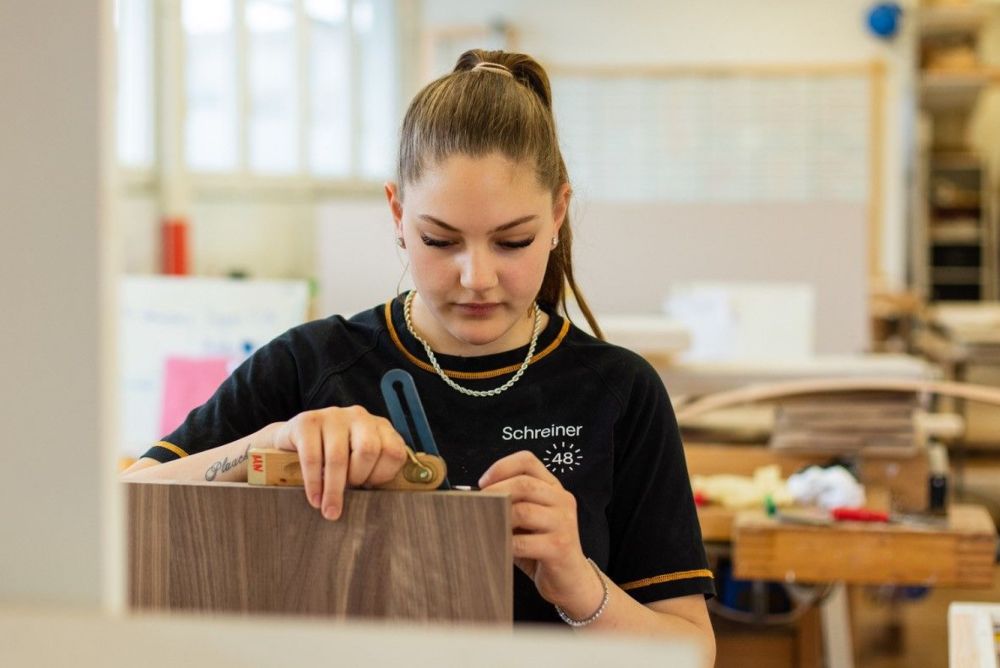 Jedes Jahr vergibt Schreiner48 drei Lehrstellen – idealerweise geht mindestens eine davon an eine Bewerberin. Evelin, Michelle und Andreina ist es bereits gelungen, einen dieser Plätze zu schnappen. Sie stehen heute erfolgreiche «ihre Frau» in einem noch immer sehr männerlastigen Beruf. Michelle sieht aber genau das sehr positiv: «Ehrlich gesagt, war das mit ein Grund, warum ich mich für die Schreinerlehre entschieden habe. Ich wollte nicht mit vielen anderen Mädels die Lehre machen.» Zu den Voraussetzungen für die Schreinerlehre meint Andreina: «Man muss schon eine Person sein, die gerne anpackt. Auch Kritik wird oft sehr direkt ausgesprochen, was für eine schüchterne Person vielleicht etwas viel ist.» Aber all diese Anforderungen können ohne Probleme von jungen Frauen erfüllt werden. David Hauser, Teamleiter der Schreiner48 Academy, schätzt die Frauenpower in seiner Lehrwerkstatt: «Mädchen sind in diesem Alter viel konzentrierter und arbeiten genauer. Sie sind in der Entwicklung oft schon einen Schritt voraus und überzeugen mit einer Eigeninitiative, die wir von ihren männlichen Kollegen weniger kennen.»
