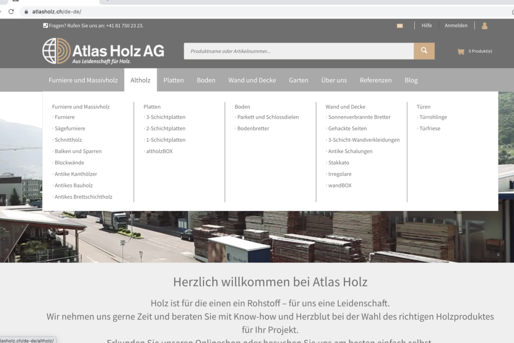 Der Webshop der Atlas Holz AG bietet mehrere Wege zum schnellen Auffinden eines Werkstoffes im breiten Sortiment und besticht durch die übersichtliche funktionale sowie sachliche Präsentation, ohne dabei Wünsche offen zu lassen.