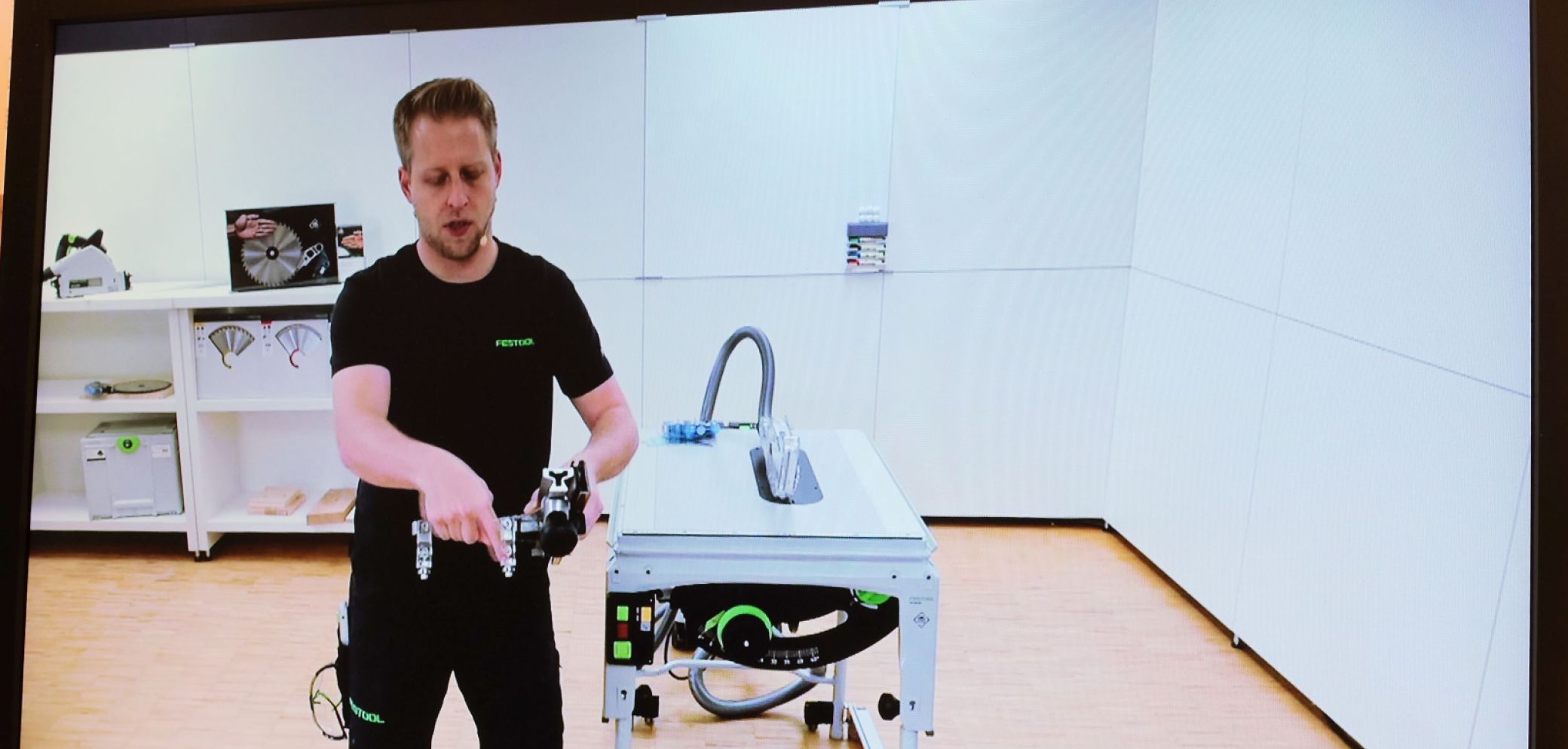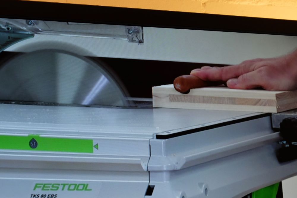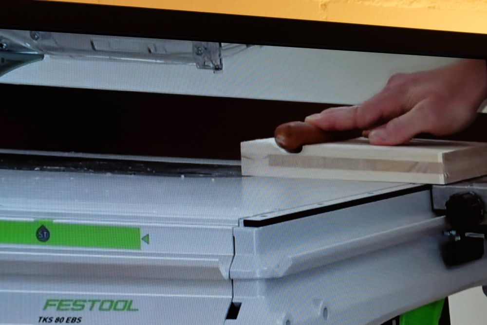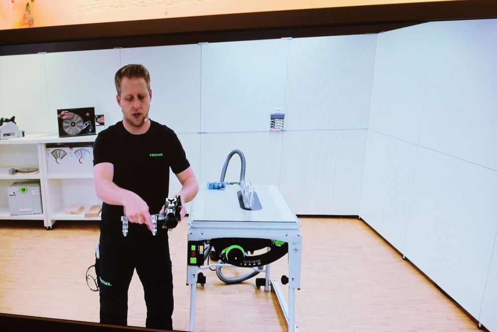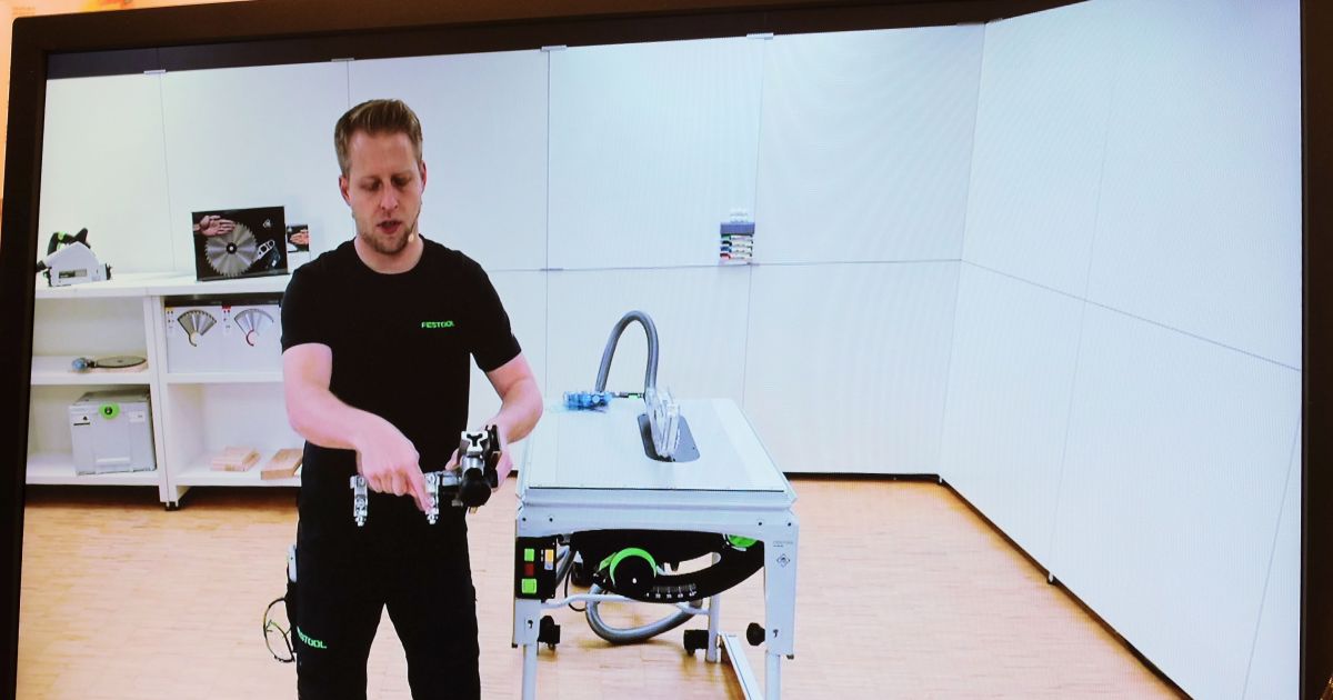 Instruktor Sascha von Festool erklärt online die Vorteile des Winkelanschlags für die Tischkreissäge «TKS 80 EBS» (im Hintergrund). Bild: Stefan Hilzinger