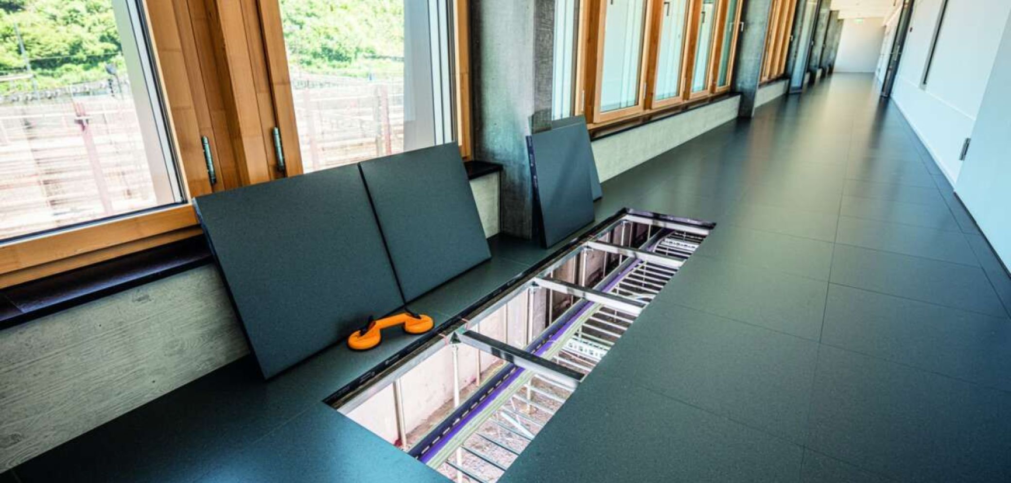 Es versteht sich von selbst, dass in einem Bauablauf ein Doppelboden recht früh eingebaut wird, weil dann Hauptleitungen schon an den Stützen vorbei verlegt werden müssen. Von diesem Zeitpunkt an sind auch die fertig belegten Bodenplatten in Gebrauch. Damit diese über all die Monate mit den verschiedenen Handwerkern, die in diesem Raum noch arbeiten, nicht Schaden nehmen, werden Schutzvliese eingesetzt. Die Firma Fritz Landolt AG aus Näfels GL bietet solche selbsthaftende Produkte an. Das Schutzvlies «Allprotect Original» wird beispielsweise passgenau auf das Mass der Platten konfektioniert und auf die zu schützende Oberfläche aufgeklebt. Die Platten bleiben so einzeln entnehmbar. Gemäss Hersteller kann das Vlies selbst nach intensiver Belastung einer mehrmonatigen Bauphase einfach und rückstandsfrei wieder entfernt werden. Der Bodenbelag benötigt dann nur noch eine Endreinigung.