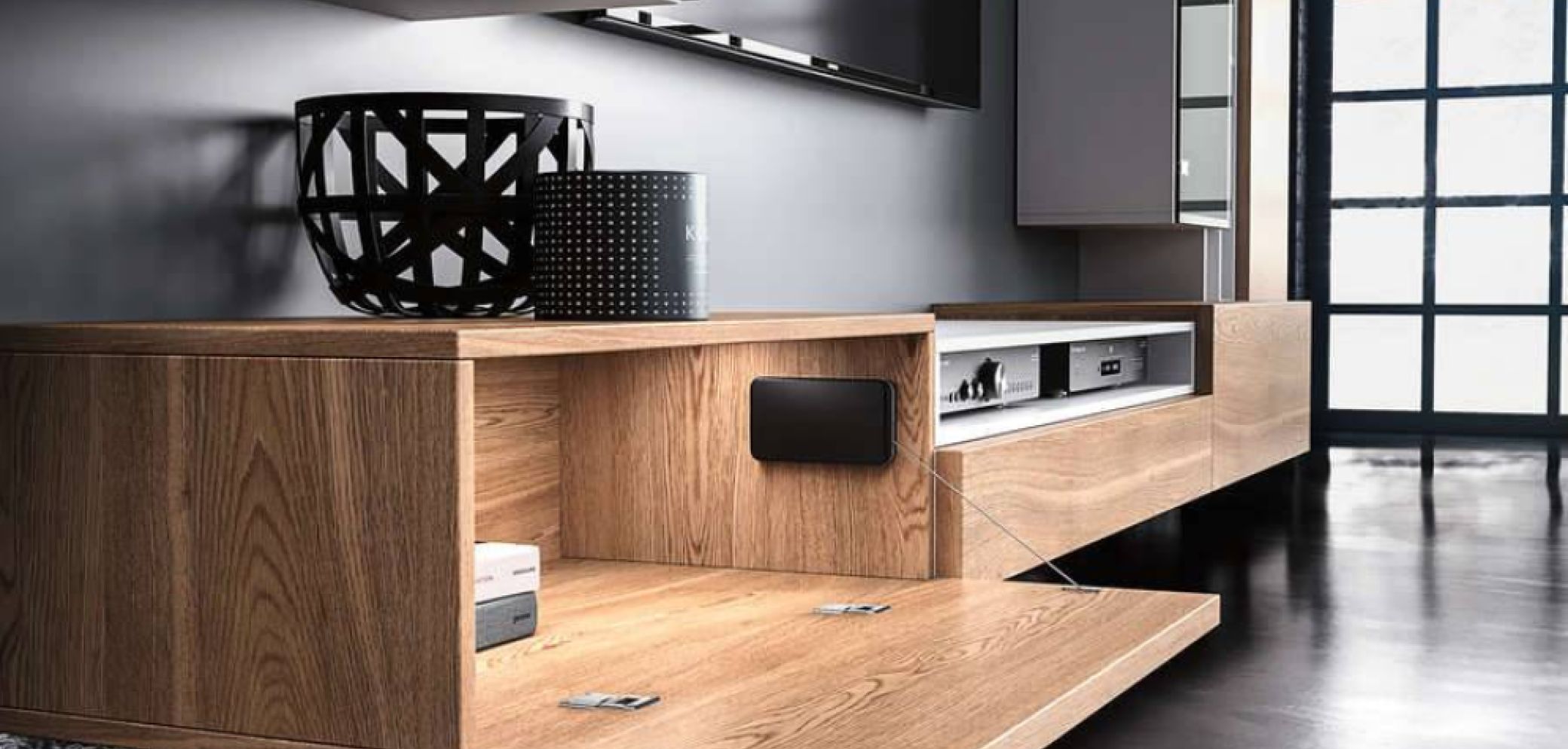 Hinter feinen Abdeckungen und zeitgemäss gestalteten Aussenflächen wird die Bandmechanik versteckt. Ebenso wird auf plumpe, grosse Aufschriften verzichtet. Grass hat mit «Tiomos» ein Klappenscharnier geschaffen, das unter der elegant minimalistischen Form die volle Einstellbarkeit in drei Richtungen gewährleistet und sich mit einer klappenseitigen Bohrtiefe von 12 mm auch für dünnere Fronten eignet. Der Klappenhalter «Kinvaro D» mit Seilzug übernimmt die Öffnungsdämpfung sowie das sanfte Schliessen. Dadurch ist die Abstimmung auf die jeweilige Klappengrösse recht einfach.
