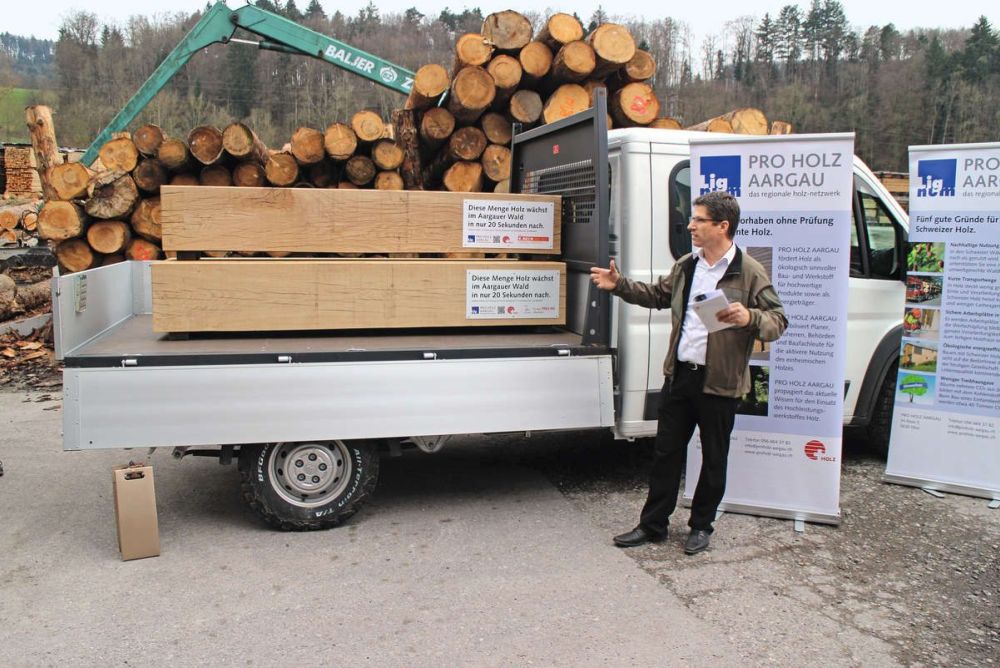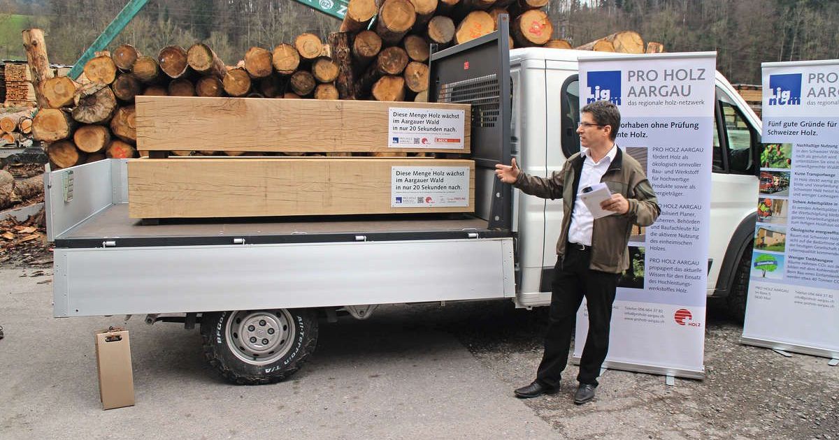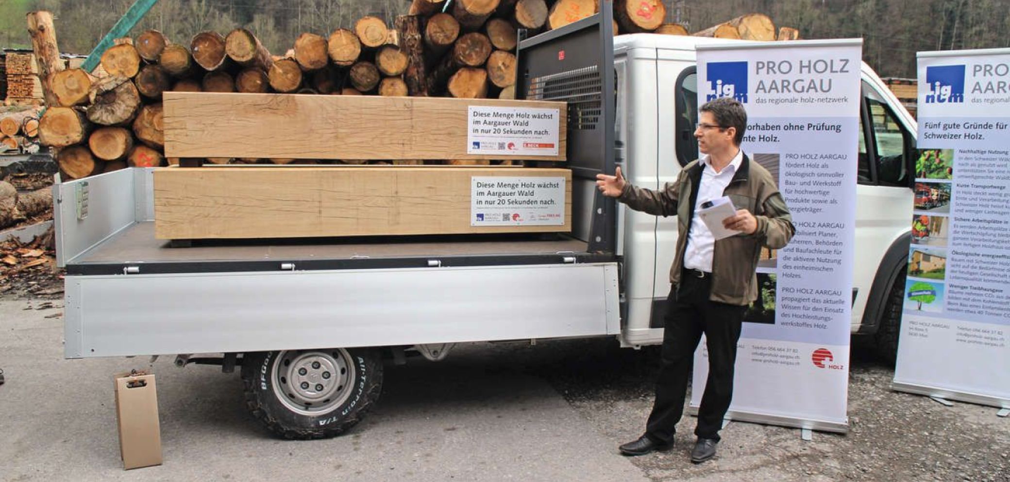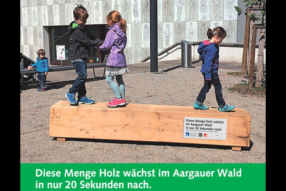 Rund ein Drittel des Kantons Aargau ist mit Wald bedeckt. Damit zählt er zu den waldreichsten Kantonen der Schweiz. In nur einer Minute wächst mehr als ein Kubikmeter Holz nach, in 20 Sekunden mehr als das Drittel eines Kubikmeters. Pro Holz Aargau, die Interessenorganisation der Aargauer Holzkette, schätzt den Ertrag pro 20 Sekunden auf knapp 0,4 Kubikmeter. Das wäre wohl kaum die entscheidende Messgrösse, würde diesen 0,4 Kubikmetern nicht noch eine zweite Bedeutung zukommen. Genau- so gross ist nämlich das Volumen von quaderförmigen Holzbänken, die Pro Holz Aargau im Moment zum Kauf anbietet. Die Masse der Bank betragen 240 × 40 × 40 cm.