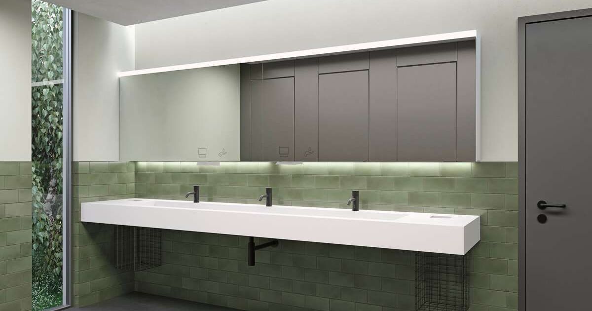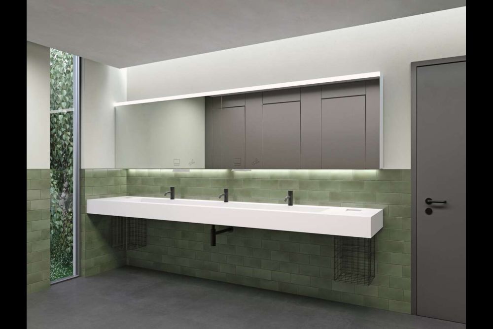 Orte, die stark frequentiert sind, stellen besondere ästhetische und funktionale Anforderungen an die Waschplätze. Talsee bietet mit «Public» eine Komplettlösung an: Der Mineralwerkstoff Corian erlaubt es, Waschtische mit fugenlos integrierten Waschbecken zu erstellen, die keinerlei Ablagerungsecken für Schmutz bieten. Waschbecken und Unterbauten lassen sich zudem exakt an die Bedürfnisse und die räumlichen Gegebenheiten anpassen. Technische Installationen für Armaturen oder Seifenspender können direkt in den Waschplatz integriert werden. Das gilt auch für integrierte Wickeltische und Einwürfe für Papier oder Abfall. Ergänzt wird das Angebot mit passenden Spiegel- und Lichtelementen sowie Zubehör für die Trocknung. Alles wird aufeinander abgestimmt – mit dem Fokus auf Nachhaltigkeit und tiefen Betriebskosten.