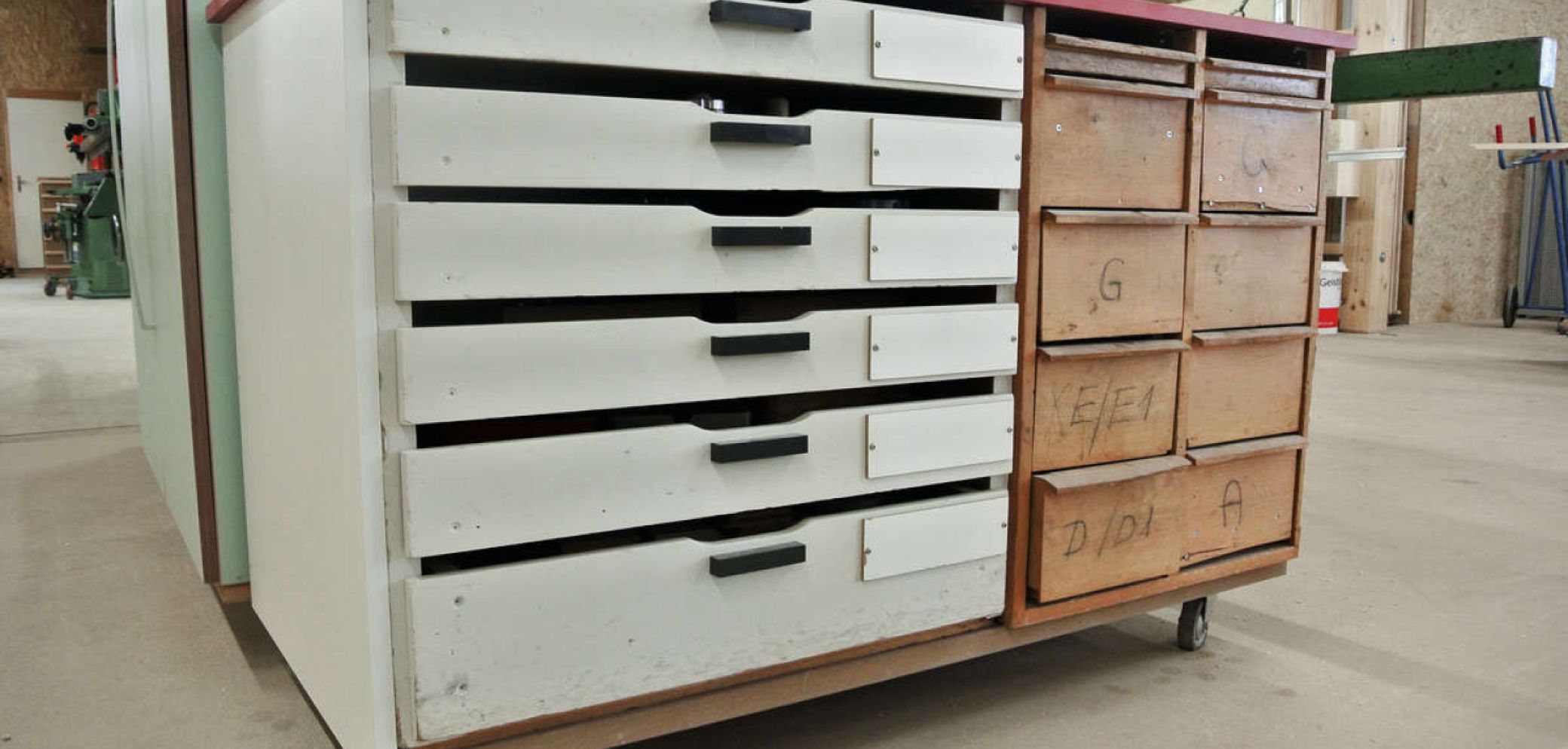 Die Kehlmaschine wird zwar gemeinsam ge-nutzt, aber jede Firma hat ihr eigenes Kehl-werkzeug in ihrer Hälfte des Werkstatt-möbels.