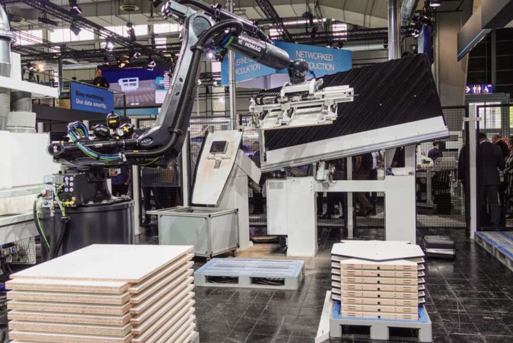 Roboter, die Maschinen bestückten, Platten und Beschläge in eigens konstruierten Lagern verstauten, Werkstücke direkt an Arbeitsstationen bearbeiteten oder auch einfach einen Bohrautomaten in der Werkstatt bedienten, zogen das Interesse auf sich. Die Grundlagen für einen Praxistransfer dieser neuen Technologien in die produzierende Werkstatt ist in greifbarer Nähe. Zudem zeigten viele Hersteller ihre Maschinenlösungen direkt in Verbindung mit angeschlossenen Partnern. So gab es einige CNC-Maschinen mit Roboterbestückung, Kantenleimmaschinen mit direkt angeschlossenem Bohrzentrum oder Zuschnitt- und Nestinglösungen in Kombination mit Bohrautomaten.