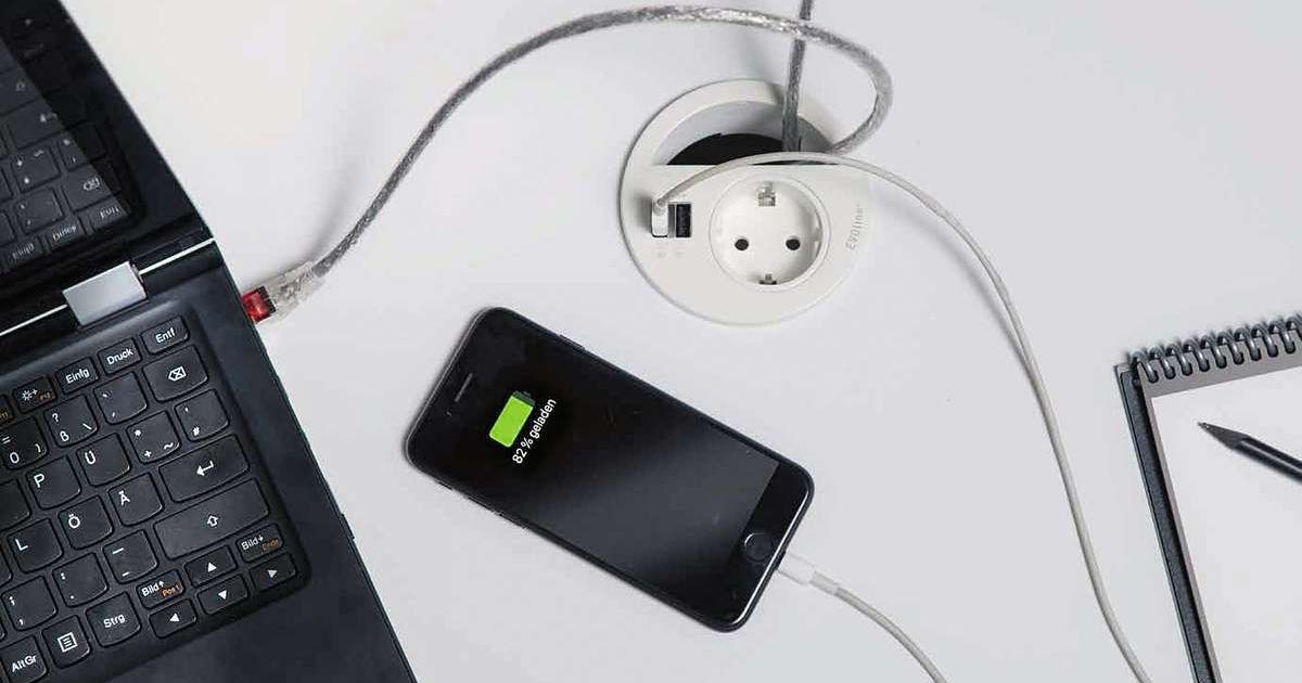 Evoline bietet mit «Circle 80» einen Kabeldurchgang für Möbel an, der auch einen Doppel-USB-Charger sowie ein Steckdosenmodul enthält. Alle international üblichen Steckdosen sind dazu verfügbar. Mittels eines Systemdeckels ist auch das kabellose Laden durch die Qi-Funktion mit Induktion möglich.