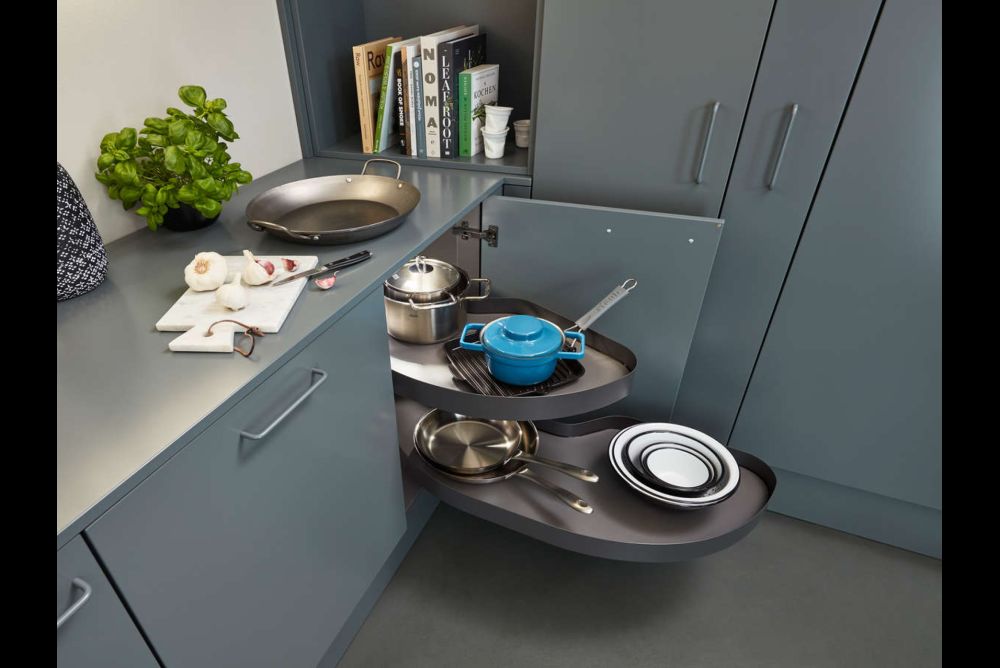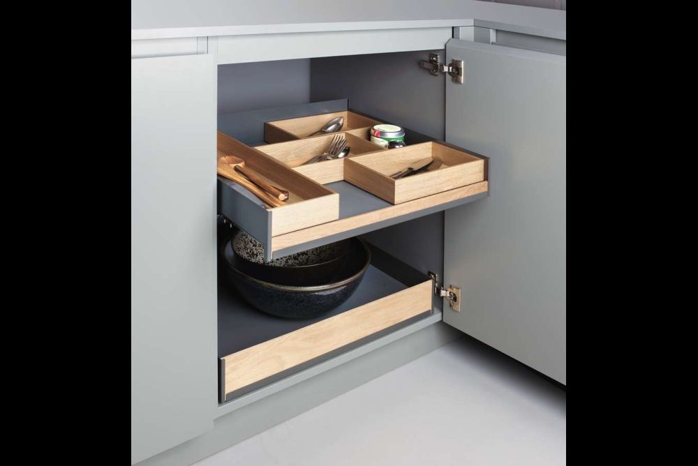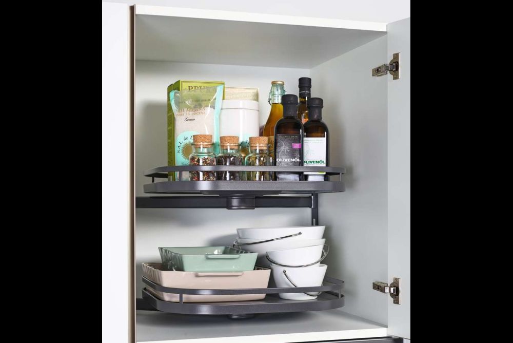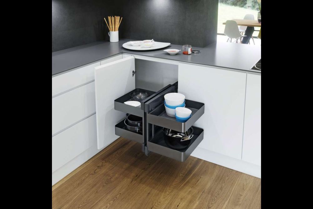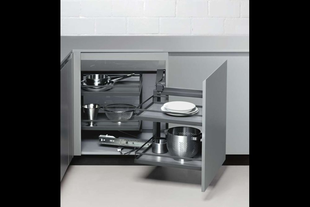 Eine zusätzliche Wirkung zeigen dann noch die Hochschrankauszüge, deren Tablare diese Einsteckleisten seitlich haben. Unterschränke laufen oft um die Ecke, was gerne zu unbenutzbaren Räumen führt, denn Tablare sind schlecht zugänglich und die häufig anzutreffenden Karussells nutzen das vorhandene Volumen nicht voll aus. Mit «VS COR Fold» von Vauth-Sagel und «Magic Corner» von Kesseböhmer und Peka gibt es Tablarregale mit quadratischem Grundriss, die den Innenraum weitgehend nutzen können und nacheinander vollständig aus der Ecknische herausfahren. Dabei kann die Möbeltür am Korpus oder am ersten Regal angeschlagen sein.