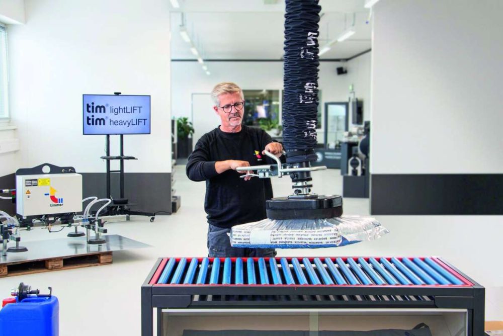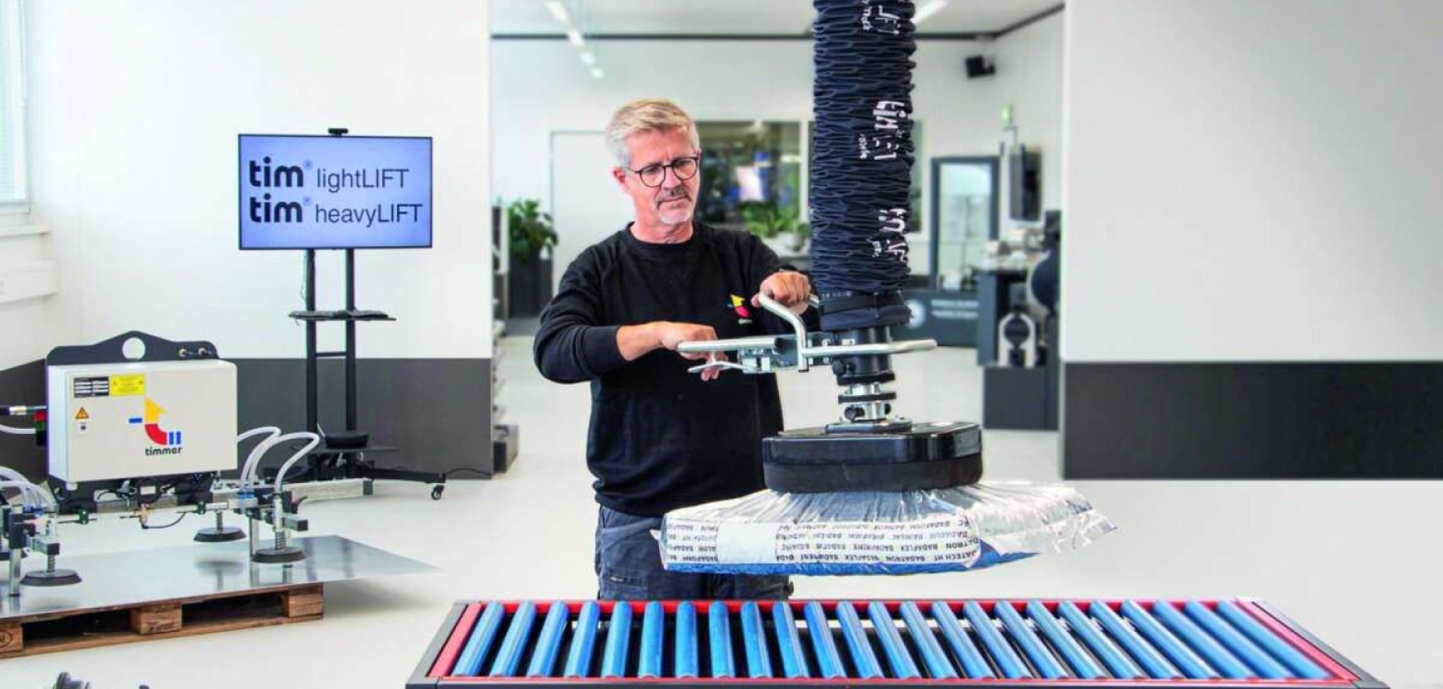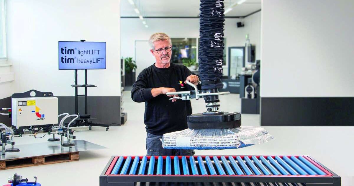 In nahezu jedem Industriezweig finden Produkte der Vakuumhebetechnik Anwendung. Solche Lösungen sind in erster Linie rückenschonende Hebehilfen für Mitarbeiter und somit ein wichtiger Teil des Arbeitsschutzes in Betrieben unterschiedlicher Branchen. Mit dem Lightlift von Timmer erfolgt das Heben und Senken von Lasten bis zu 50 kg nicht nur ergonomisch, sondern auch sicher. Durch die Zweihandbedienung lassen sich auch sperrige Hebegüter mit zwei Händen führen. Die Bedieneinheit verfügt über einen variablen Handgriff, der in verschiedenen Grössen lieferbar ist. Das Schnellwechselsystem ermöglicht bei Bedarf den schnellen Austausch der Sauger für unterschiedliche Hebegüter.