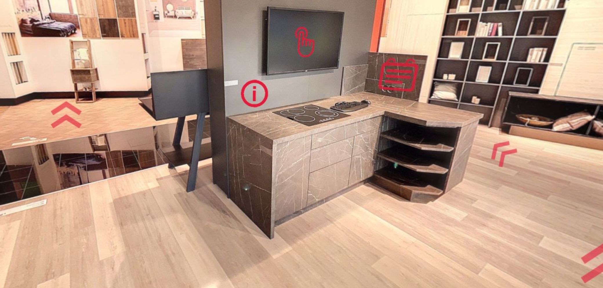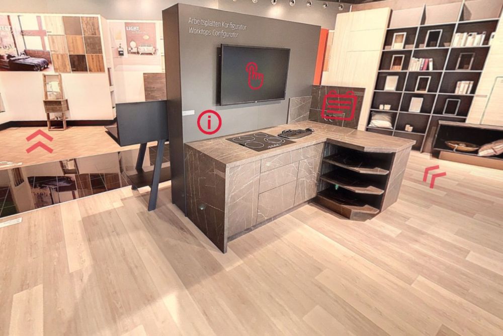So präsentiert sich der virtuelle Rundgang durch die Produktewelt des Werkstoff-Anbieters Egger. Bild: Egger