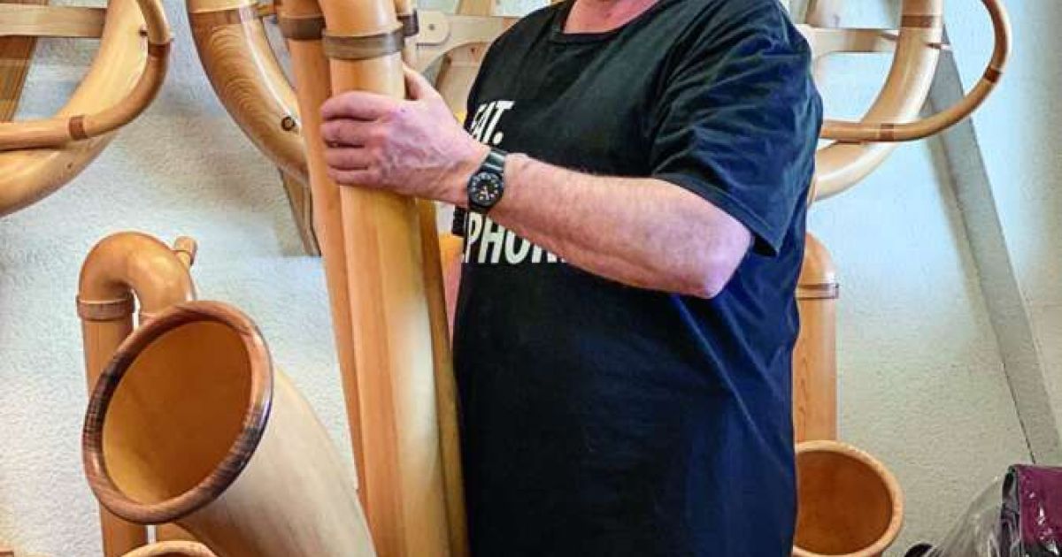In seiner Werkstatt stösst man auf Unikate und Kuriositäten. Der Tüftler mag es, eigenwillig geformte Blasinstrumente zu kreieren oder besondere Materialien zu verwenden. So beispielsweise bei seinem Saxofon aus Erlenholz oder den Alphörnern aus Epoxidharz. Das gebe es sonst auf der ganzen Welt nirgends.