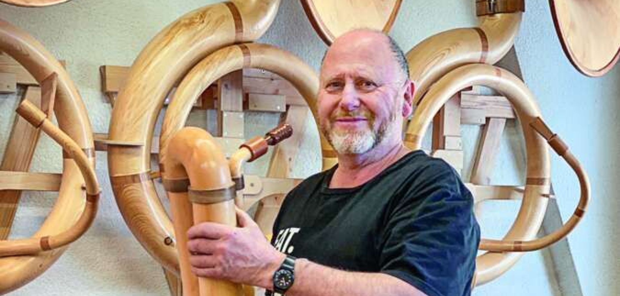 Es war ein Treffen mit einem Schreiner vor rund zehn Jahren, das Beat Huber eine neue Leidenschaft entdecken liess. «Er weihte mich in die Geheimnisse des Alphornbauens ein, und ich habe mir gesagt: ‹Was er kann, kann ich auch.›», erzählt Huber. Und so wurde der gelernte Zimmermann auch ein wenig zum Schreiner und revolutionierte die Welt des Alphorns. «Zu Beginn habe ich alles von Hand hergestellt», sagt er. Bis eines seiner Alphörner die Werkstatt verliess, verflossen 90 Stunden. Später rüstete er auf und kaufte sich eine CNC-Maschine. Das Programmieren hat er sich selbst beigebracht. Huber ist einer, der gerne tüftelt und Neues erfindet. Die Ideen fliegen ihm zu. Inspiration holt er sich manchmal in der weiten Welt des Internets. «Wenn ich etwas entdecke, greife ich die Idee auf, wandle sie ab und mache sie zu etwas ganz Eigenem.» Der 64-Jährige arbeitet als Teilzeit-Gärtner und hat sich nebenbei vollkommen dem Alphornbau verschrieben. Er verlässt gerne vorgegebene Wege und setzt seine eigenen Massstäbe. Mit neuen Akzenten hat er die althergebrachte Schweizer Alphornszene aufgemischt. Ursprünglich waren alle Alphörner «eingebunden», also mit Holzstreifen aus Rattan oder Peddigrohr umwickelt. Er habe aufgehört, die Alphörner einzubinden, weil das Holz ohne diese Streifen viel besser vibriere und klarere Klänge hervorbringe. Mit dem Bruch dieser jahrhundertealten Tradition sorgte er anfänglich für Entrüstung unter den eingesessenen Alphornbläsern. «Heute verzichten viele auf diese Einbindung», sagt Huber schmunzelnd.
