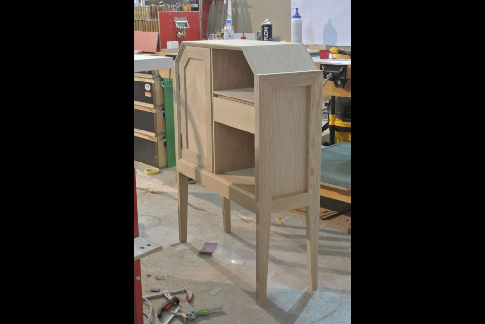 Sven muss um 12.15 Uhr (Abu Dhabi Zeit) fertig sein. Auch Fabio verleimt die Teile seines zweiten Fragments. Er nimmt sich viel Zeit für die Verleimung. Die letzten Minuten brechen an. Sven wird auf den Schlusspfiff gerade so fertig. Die Schublade funktioniert, die Oberfläche ist sauber. Fabio hat eine Viertelstunde länger Zeit. Auch sein Stehpult wird fertig und scheint sauber verleimt. Die Zinken hat er mit ausserordentlicher Genauigkeit hergestellt. Als die Zeit abgelaufen ist, verfliegt die Anspannung sofort.