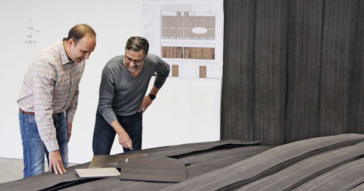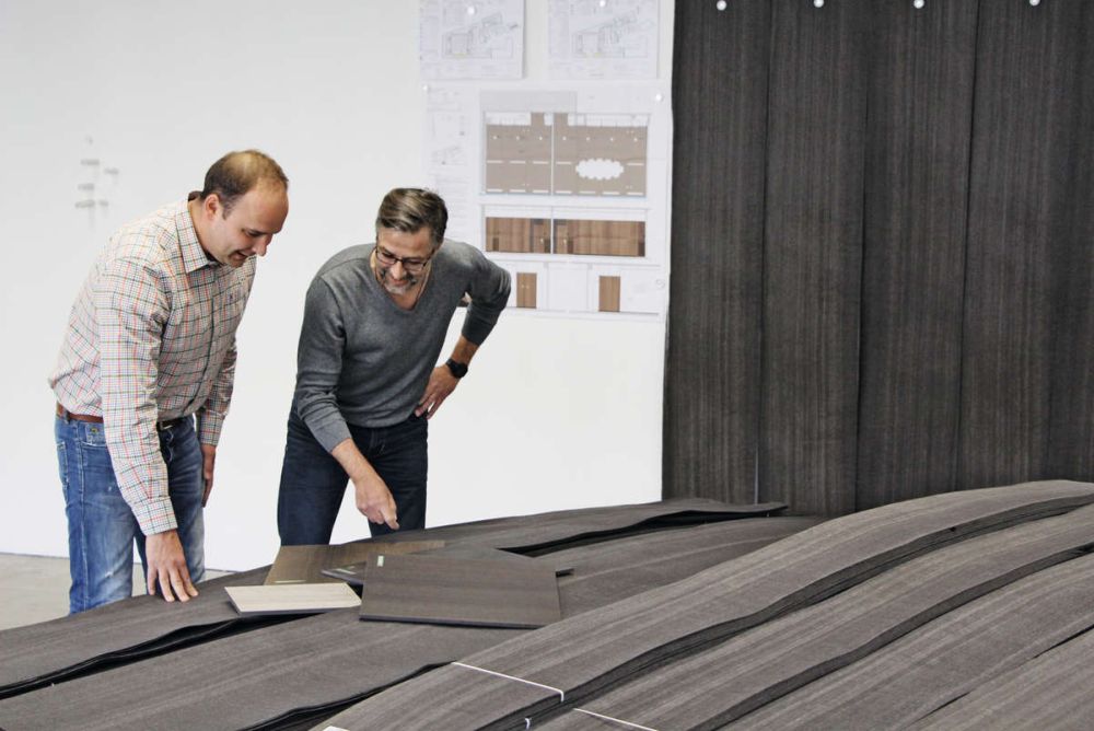 Tobias Scherg (l.), Leiter des Bereichs Furnier, und Kundenberater Andreas Zips begutachten das seltene Furnier. Bilder: Roser AG