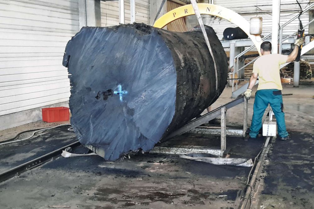 Das Holz weist bis ins Innere einen homogenen Grauton auf. Keine Äste, keine Fehlstellen, Löcher oder sonstigen Makel. Eindrücklich ist auch das Alter des Stammes. Wissenschaftler der Universität Bern haben ihn mithilfe der Radiokarbonmethode datiert. Das Resultat: Ungefähr 2600 Jahre lag der Koloss in einer Kiesgrube in Polen, um sich langsam durch und durch zu verfärben. «Es sind schon einige Moor- und Kieseichen gefunden worden. Meistens weisen diese zum Stamminneren hin einen Farbverlauf auf, vom dunkleren Äusseren ins Bräunliche übergehend. Eine homogene graue Farbe bis ins Mark, und das bei dieser Dimension – das ist schon ein ziemlich seltenes Exemplar», sagt Scherg.
