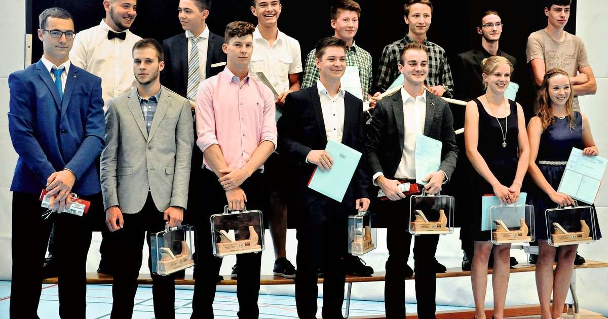 Hobel und Säge gab es für einen Notendurchschnitt von 5,3 und höher in den berufsspezifischen Fächern. Diese begehrten Trophäen wurden an 14 der 116 frischen Macherinnen und Macher ausgehändigt. Die kantonale Ehrenmeldung ab einer Gesamtnote von 5,4 und höher erreichten 8 Lehrabgängerinnen und Lehrabgänger.