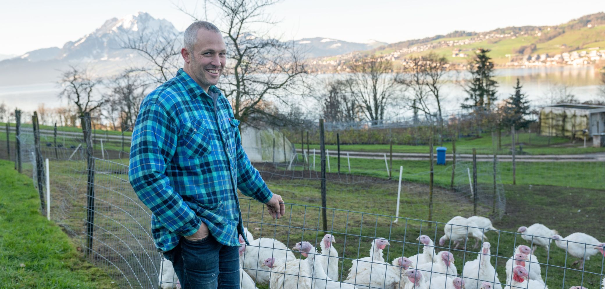 Christian Muheim (51) bei den Truthähnen, die tagsüber auf der Weide freien Auslauf haben. Bild: Caroline Mohnke