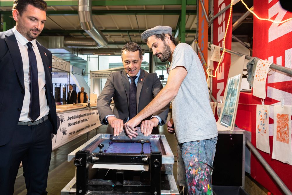 Auch der Bundesrat Ignazio Cassis konnte es sich nicht nehmen lassen und schaute in der temporären Stuhlfabrik vorbei. Der Aussenminister erwies sich als ein talentierter und geschickter Handwerker. Leider fehlte ihm die Zeit, seinen Klappstuhl selber fertig zu machen. Die Schreiner versprachen aber, ihm diesen nachzusenden. Schliesslich muss auch ein Bundesrat mal seine Füsse hochlagern können.