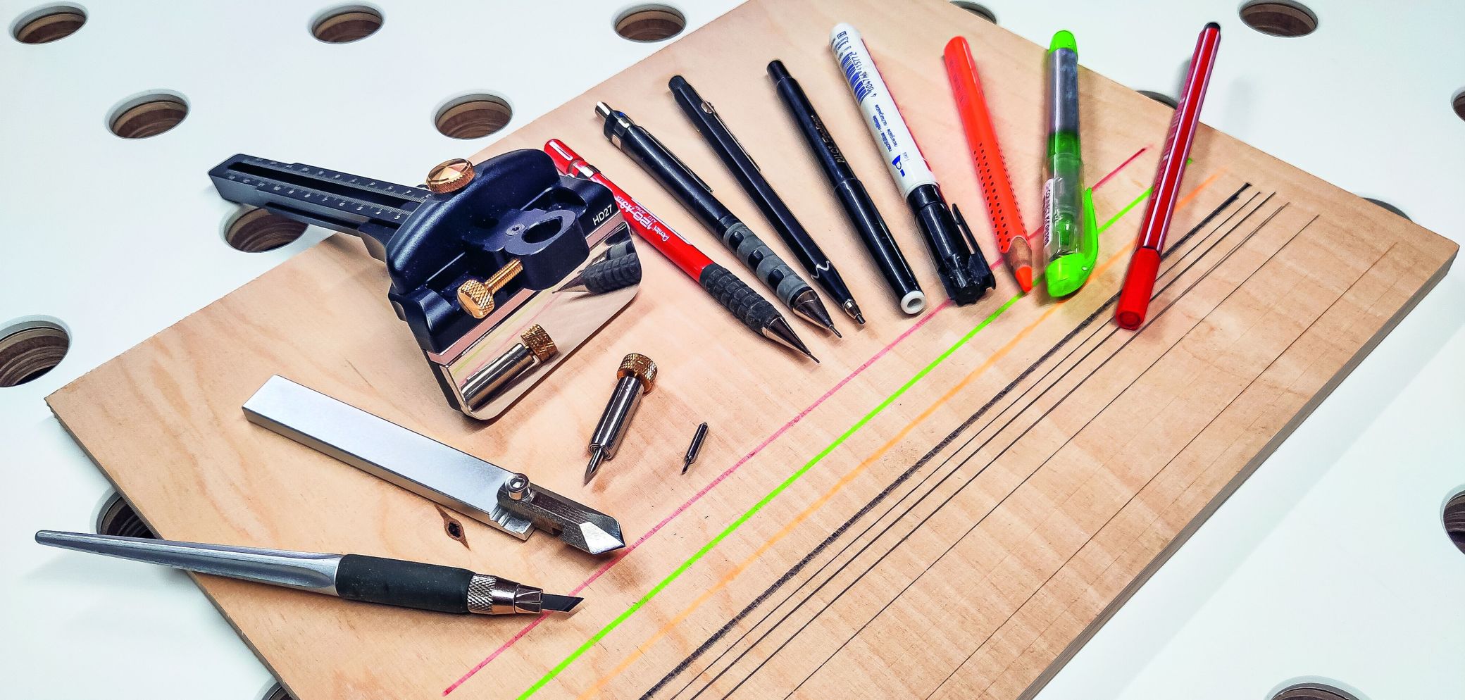 Für gerade Risse auf Massivholz empfand ich die Anreissnadeln hingegen als weniger geeignet, da sie die Tendenz haben, den Jahrringen zu folgen, wodurch der Riss manchmal etwas wackelig wird. Deutlich besser ging dies mit dem Anreissmesser.