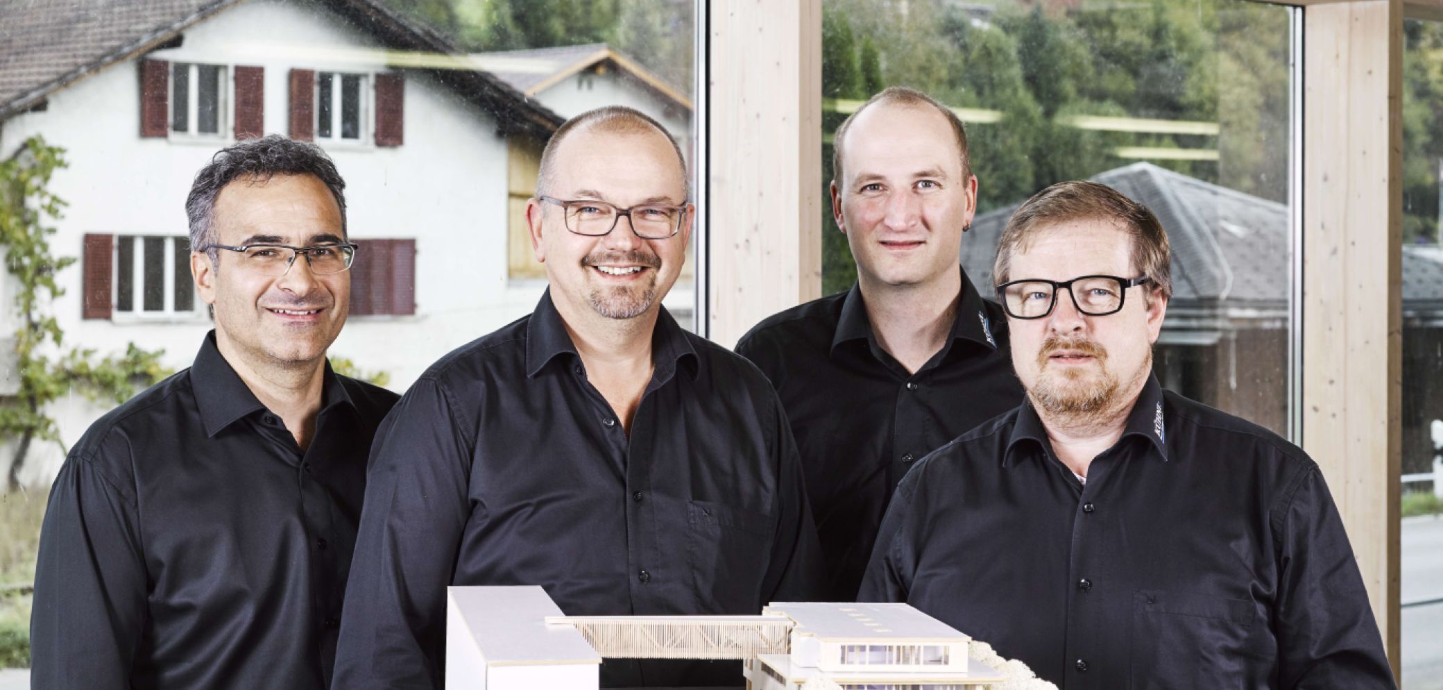 Freuen sich auf den Neubau: (v. l. n. r.) Ueli Haldemann, Ulrich Kühni, Markus Gerber und Ernst Kühni. Bild Küni AG
