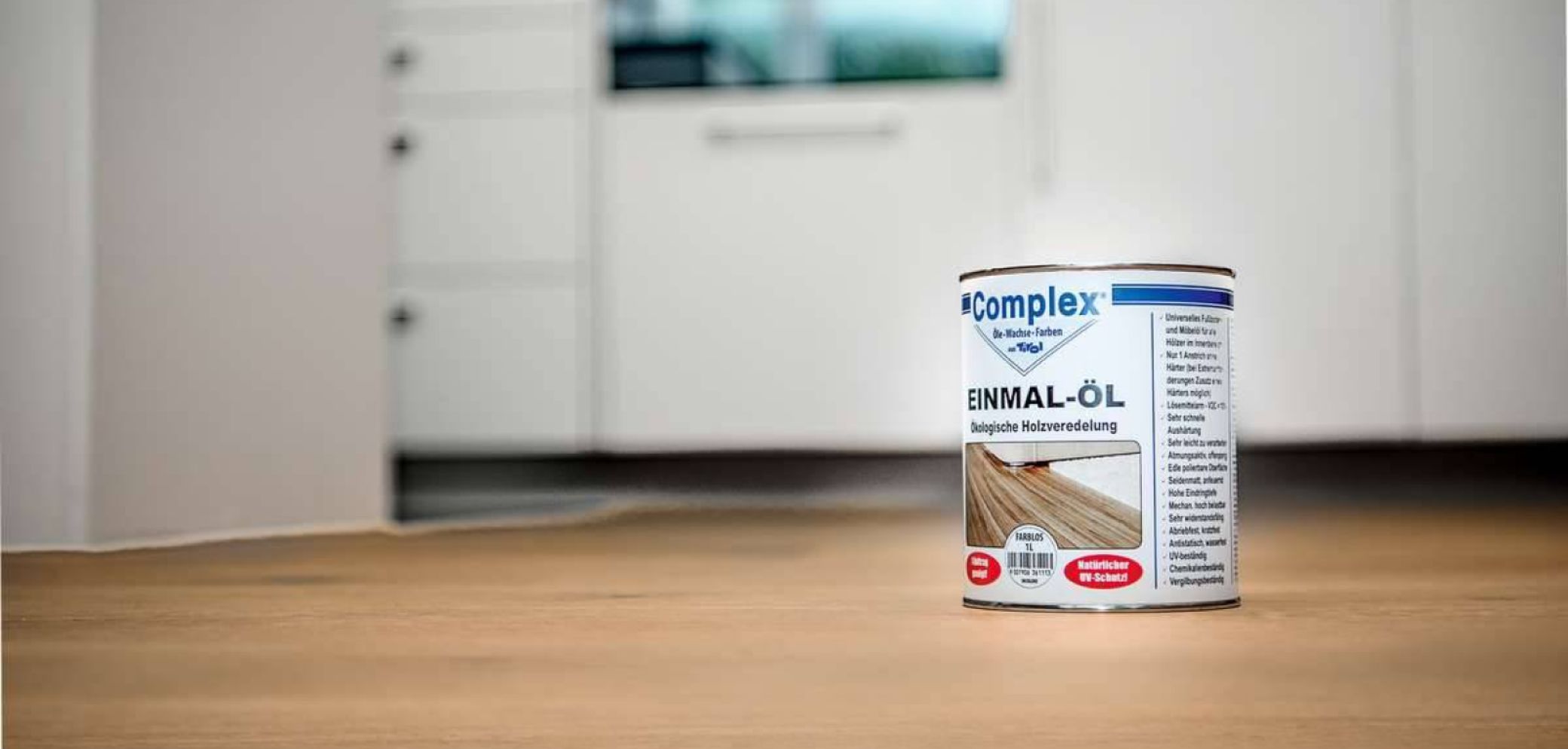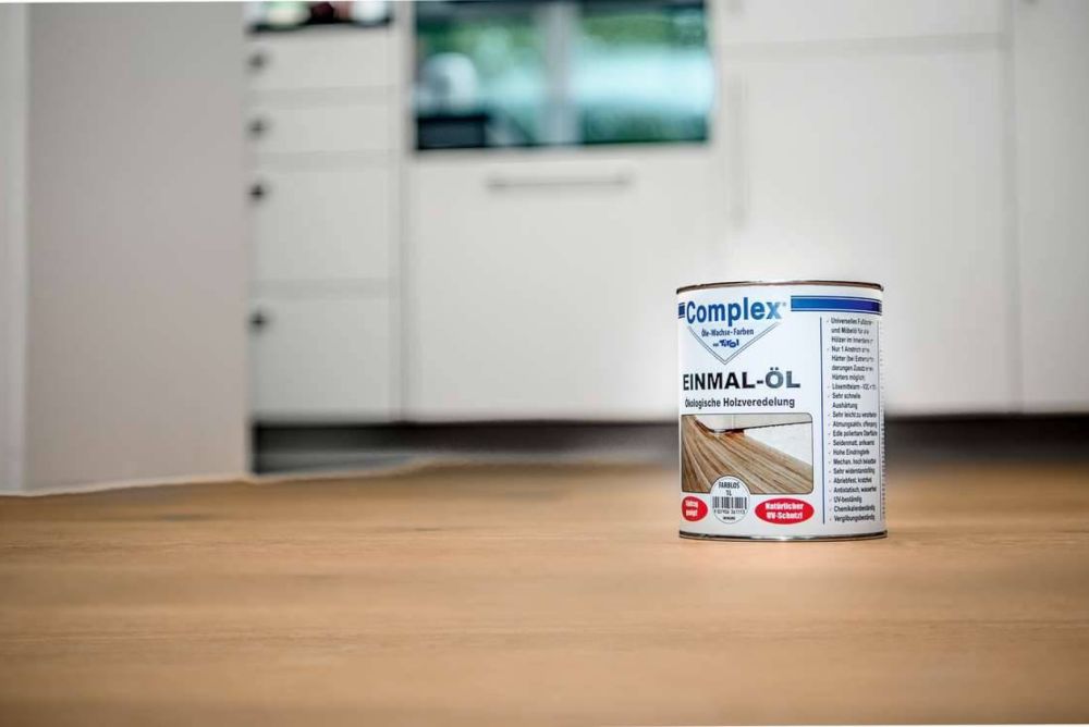 Complex-Einmal-Öl ist eine niedrigviskose Hartöl-Wachs-Kombination auf Basis von pflanzlichen Ölen und Wachsen sowie ätherischen Ölen. Es vereinigt die idealen Eigenschaften eines Hartöls in Verbindung mit hochwertigen Hartwachsen. Die natürlichen Eigenschaften, wie Atmungsaktivität, Offenporigkeit und Diffusionsfähigkeit, bleiben voll erhalten. Das neue Einmal-Öl verursacht keine elektrostatische Aufladung (Stauballergie) und keine Selbstentzündung (ohne Härter). Es ist nach EN71/T3 geprüft (Kinderspielzeugnorm). Zudem ist das Öl speichel- und schweissecht.