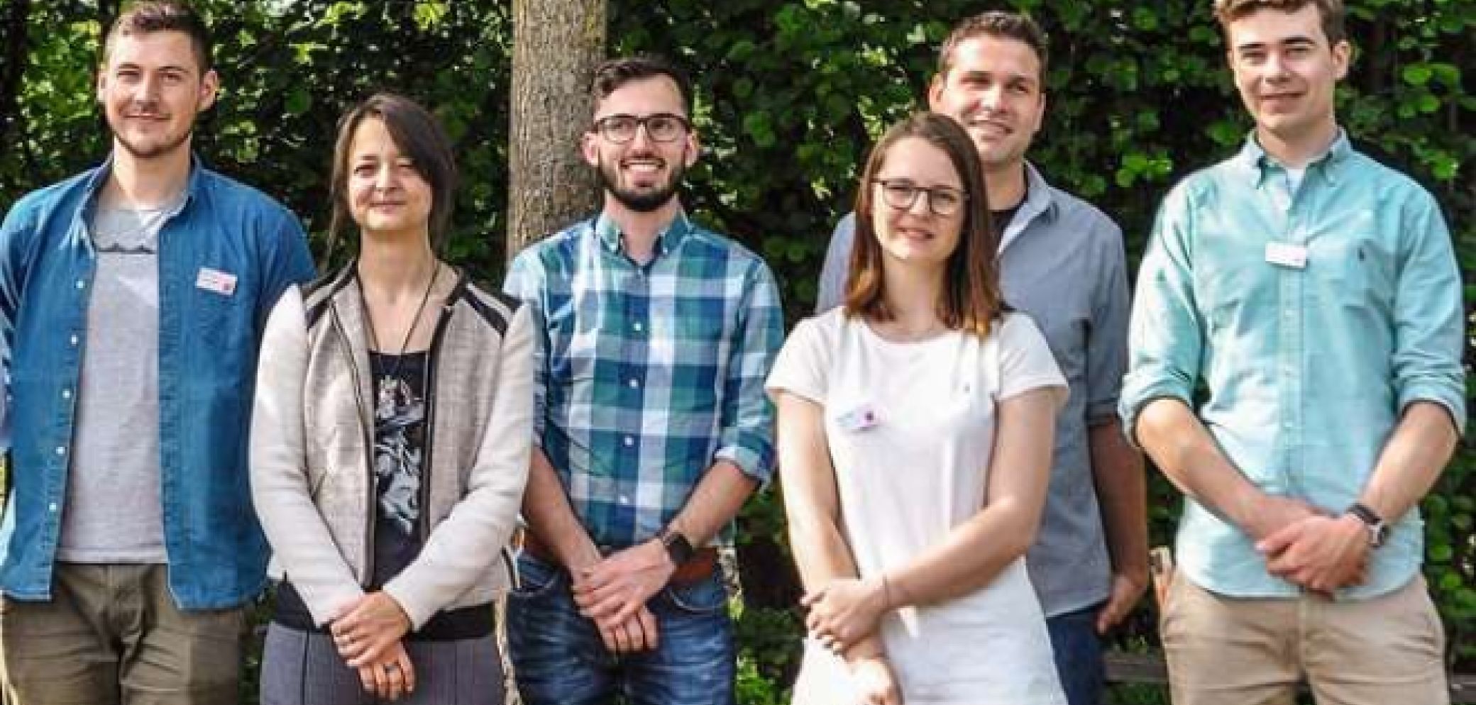 Ausbildner Jonas Fischer (2. v. r.) mit aktuellen und ehe-maligen Lernenden vor der Eiche, die bei der Akademie-Gründung gepflanzt wurde. Bild: Franziska Herren
