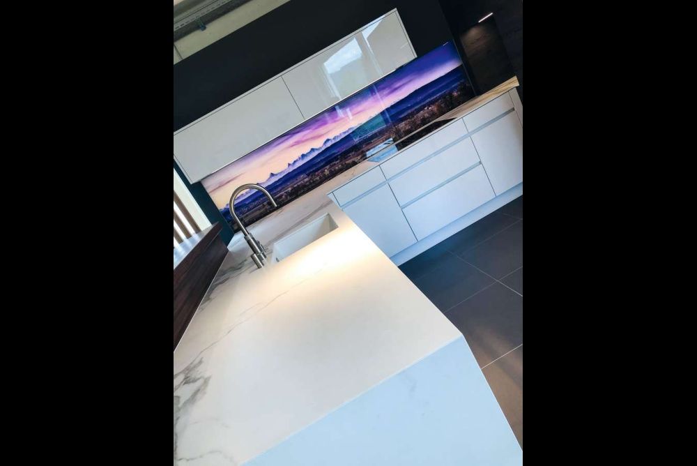 Die Rückwand kann aber auch gut als belebendes Element eingesetzt werden, wenn dem Kunden der Mut zur farbigen Front- oder zu einer ausgefallenen Arbeitsplatte fehlt. Ebenfalls interessant sind Rückwände mit Motiven. Sie beleben Gläser und andere Materialien und werden mittels Digitaldruck aufgebracht. So könnten sogar Bilder des Kunden die Rückwand zieren.
