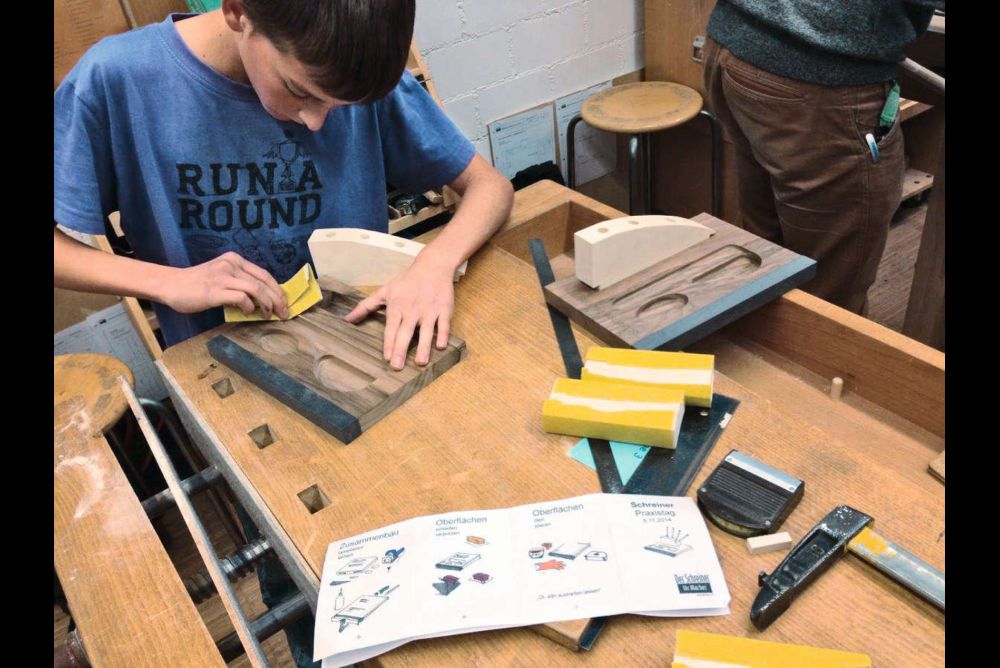 «Das grosse Interesse während der Arbeit war erfreulich», sagt Berufsschullehrer Reto Spichtig. «Und es war schön, am Ende das Tages die strahlenden Gesichter zu sehen, als die geölten Schreibtischablagen verpackt und mit nach Hause genommen werden konnten.» Neben der Arbeit in der Werkstatt konnten die Schüler an Erlebnisposten Erfahrungen sammeln. So lernten sie beispielsweise das Messen mit der Schiebelehre, die Herstellung von Kreuzfugen aus Furnier, das CAD-Zeichnen sowie das Schwinden und Quellen von Holz kennen.