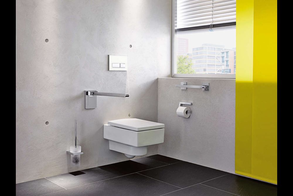 Mit dem «System 100» hat Hewi eine Badezimmerlinie mit einer klaren, geometrischen Formgebung im Produktportfolio. Das System verbindet die Funktionen Sanitär, Barrierefreiheit, Beschläge, Beschilderung und Handläufe mit einem durchgängigen Design. Im Sanitärbereich beinhaltet das System Seifenspender, Ablagen, Haken, Haltegriffe und Hand- tuchhalter.