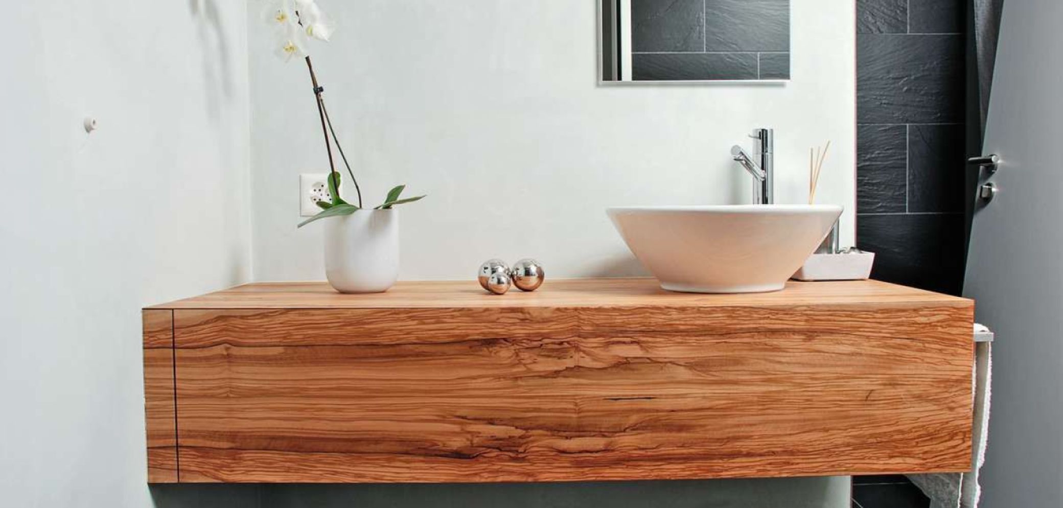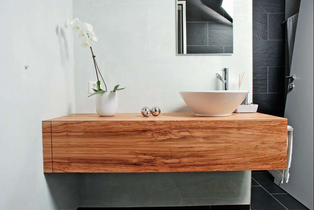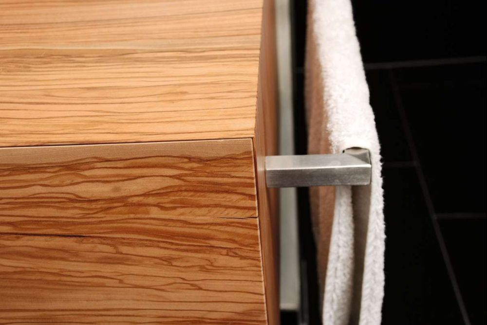 Der Gegensatz der klaren reduzierten Formgebung des Badmöbels zum wilden Olivenholz schafft eine besondere Ausstrahlung. Hinter der Front befindet sich ein Schubladenauszug für die Unterbringung der wichtigsten Utensilien.