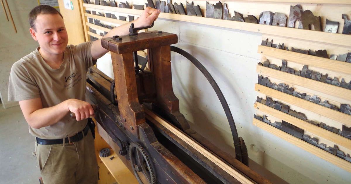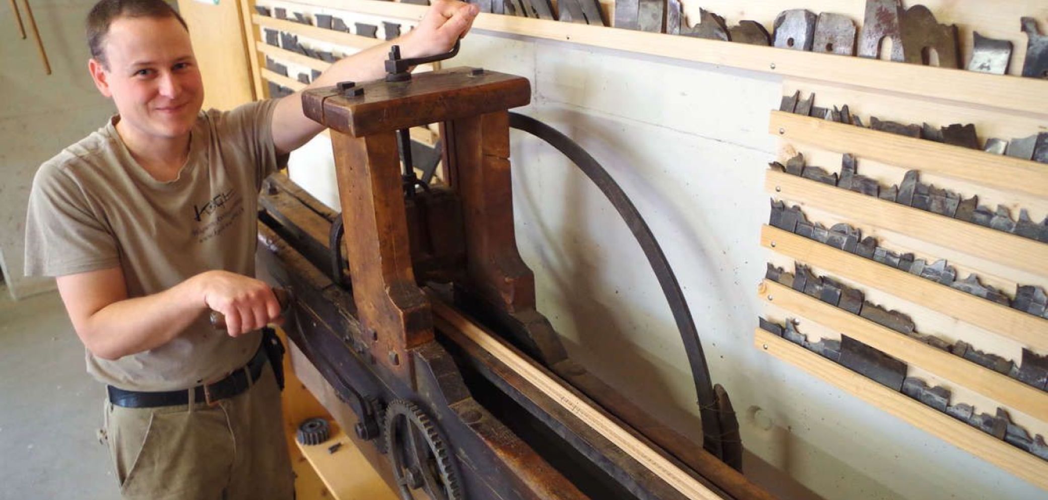 Antikschreinerei. Thomas Koch produziert Zierleisten für Ergänzungsarbeiten im historischen Bereich. Dies mit einer mehrere hundert Jahre alten Wellenleisten-Ziehbank, die der Wagner und Antikschreiner für seinen Betrieb erstanden hat und am Leben hält.